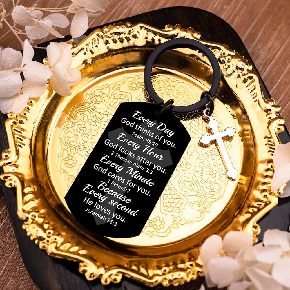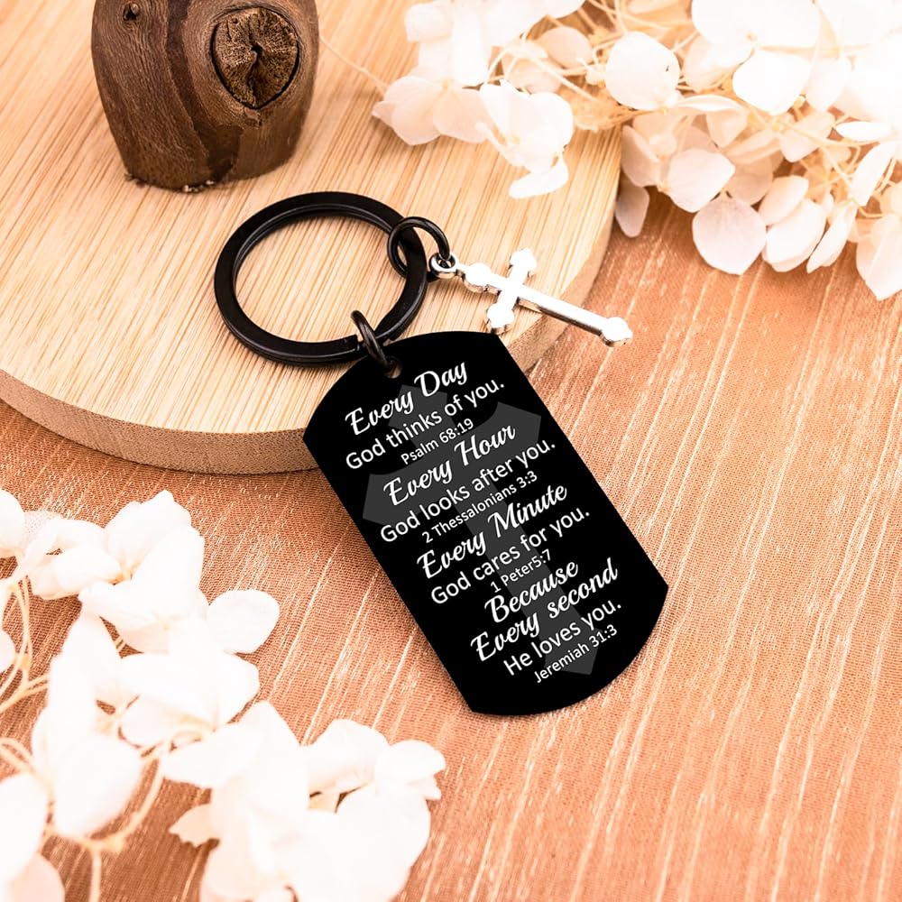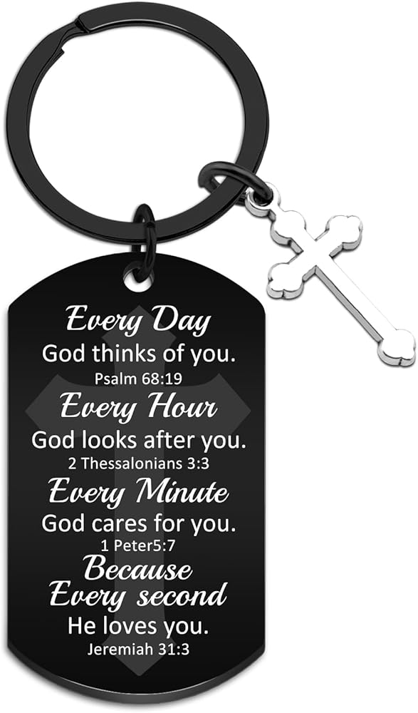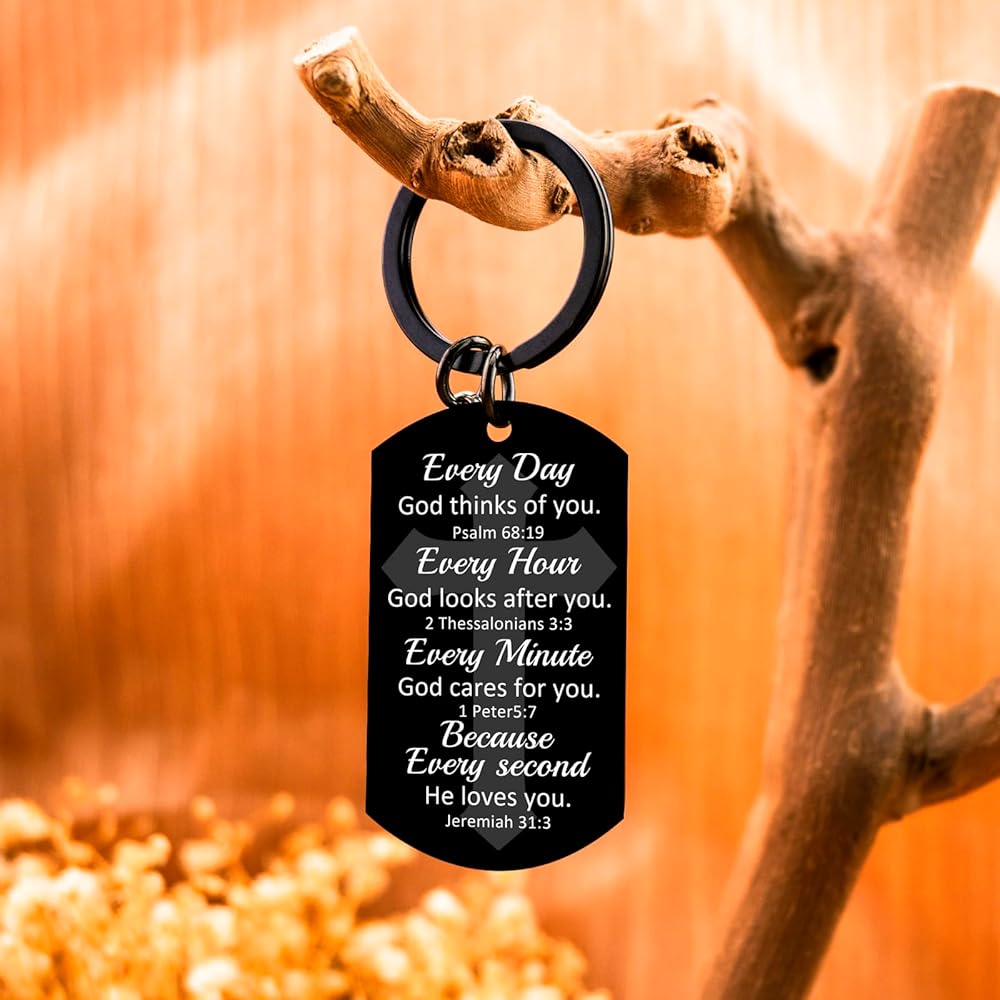 God Keychain & Christian Keychain:This Christian Keychain Features Four Powerful Bible Verses (Psalm 68:19, 2 Thessalonians 3:3, 1 Peter 5:7, Jeremiah 31:3) Reminding The Wearer Of God's Constant Love And Care. The Inspirational Keychain Serves As a Daily Faith Booster With Messages Like "Every Day God Thinks Of You" – Perfect For Quiet Reflection Or Sharing Hope.