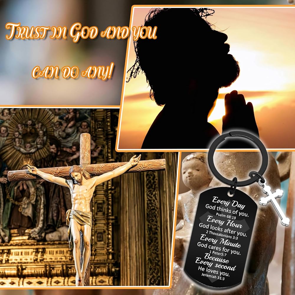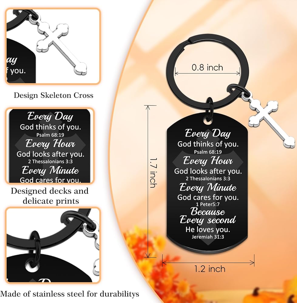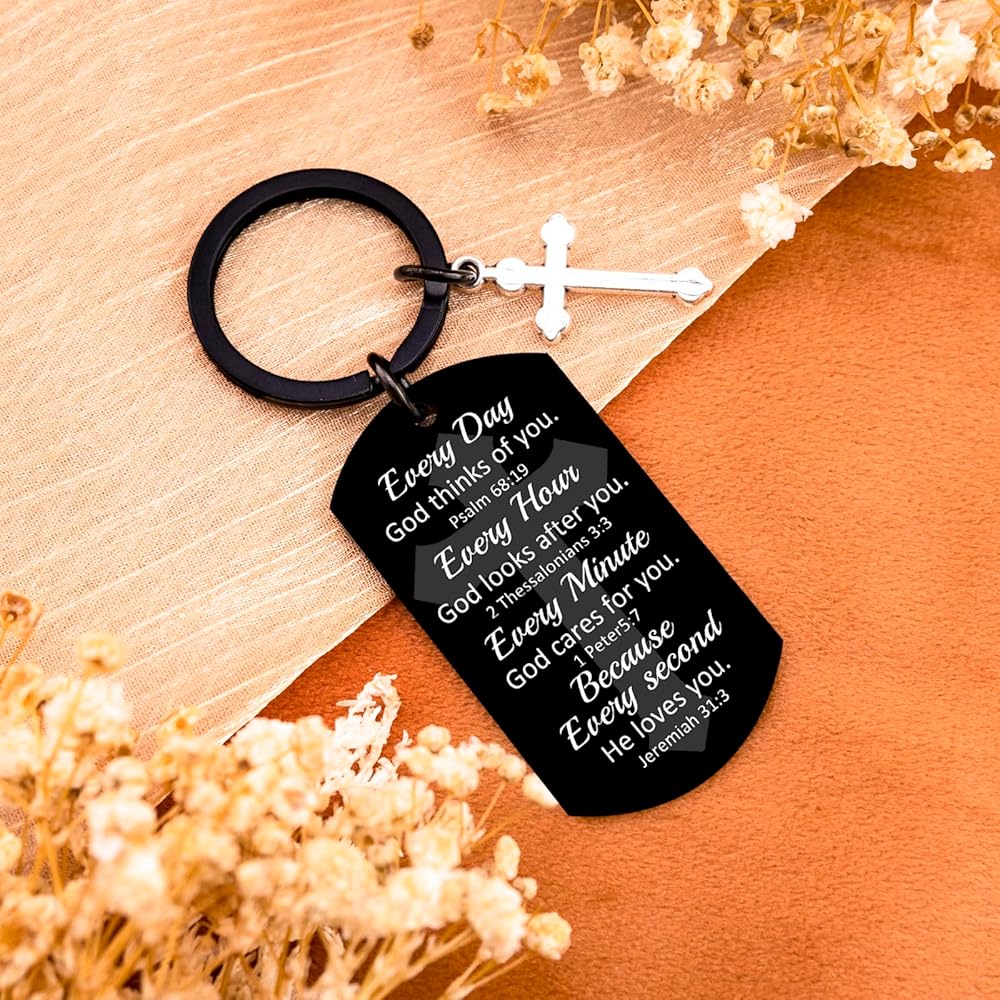 God Keychain & Christian Keychain:This Christian Keychain Features Four Powerful Bible Verses (Psalm 68:19, 2 Thessalonians 3:3, 1 Peter 5:7, Jeremiah 31:3) Reminding The Wearer Of God's Constant Love And Care. The Inspirational Keychain Serves As a Daily Faith Booster With Messages Like "Every Day God Thinks Of You" – Perfect For Quiet Reflection Or Sharing Hope.