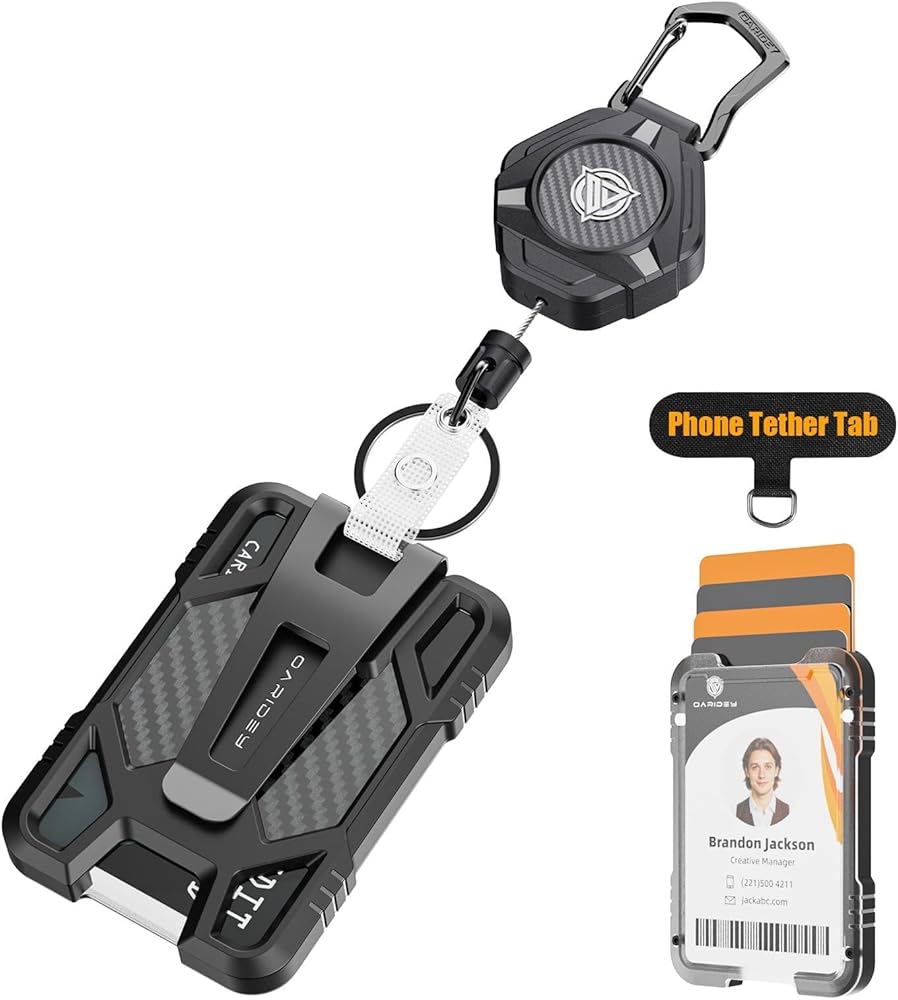 حاملات شارات قابلة للسحب من Oaridey، سلسلة مفاتيح مغناطيسية قابلة للسحب مع حامل بطاقة هوية من ألياف الكربون (تحمل 5 بطاقات)، بكرة شارة شديدة التحمل مع شريط ربط للهاتف، للعمل والاستخدام اليومي