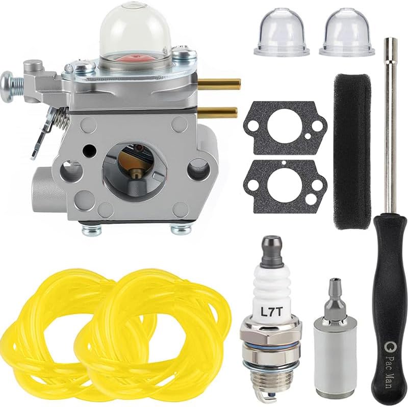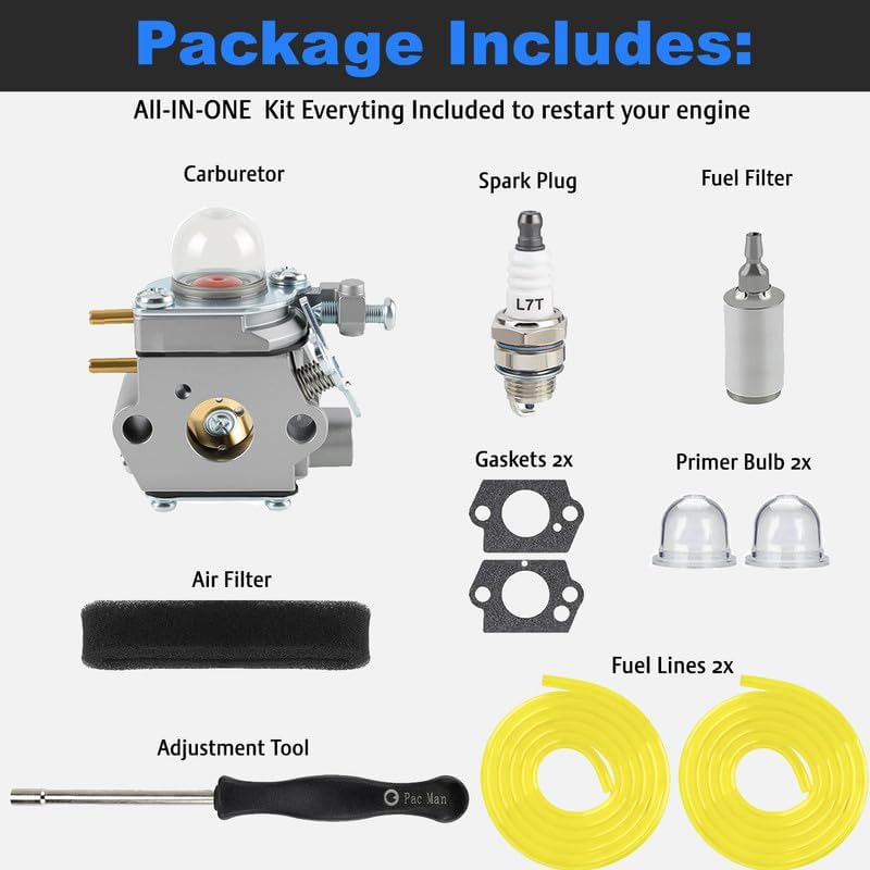 - Package Includes: Carburetor- 2x Gaskets - Spark Plug - Air Filter - Primer Bulbs - 2x Fuel Lines & Filter - Adjustment Tool