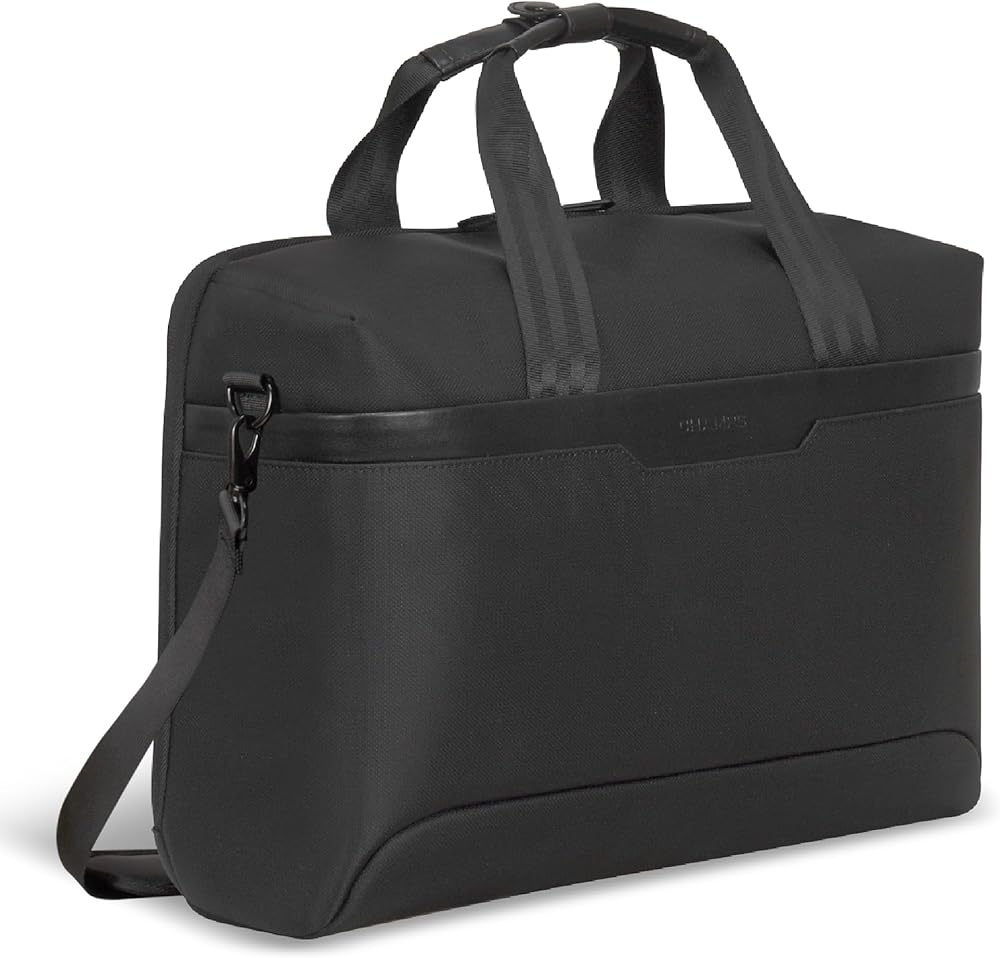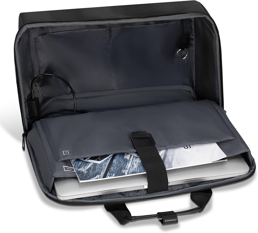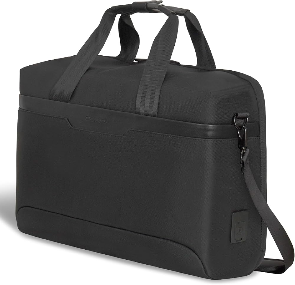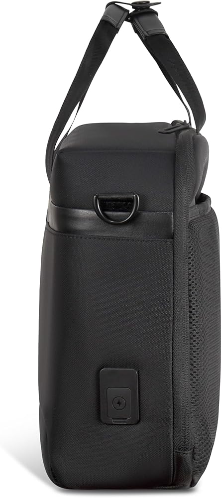 The Laptop Bag from the Onyx Collection is our modern take on the traditional laptop bag. Designed for the on-the-go professional, it's perfect for securely carrying your laptop, documents, and work essentials. Crafted from water-resistant nylon material to ensure durability and style. This sleek and functional bag is designed to meet the demands of modern life, featuring a secure RFID pocket to protect your sensitive information and adjustable air-mesh shoulder straps for unparalleled comfort. The padded 15.6" laptop and tablet sleeve with a compression strap closure provides ultimate protection for your devices, while the built-in USB-C charging port and cable keep you powered up on-the-go, making it easy to stay connected wherever you are. Attach your laptop bag to your suitcase with the trolley strap, and keep your valuables safe with a hidden zippered pocket located behind it. Inside, an inner removable key chain ensures you never lose your keys again. Combining style and functionality, this bag is the ideal choice for those who are looking for a traditional laptop bag with a modern twist.