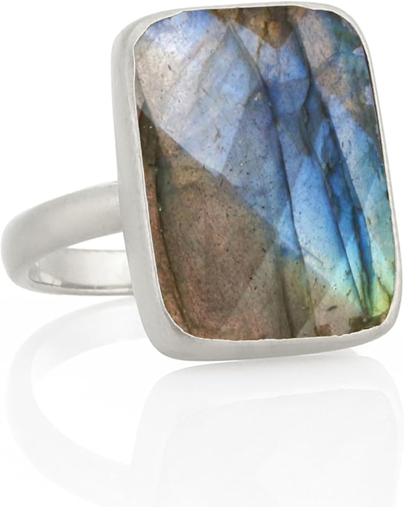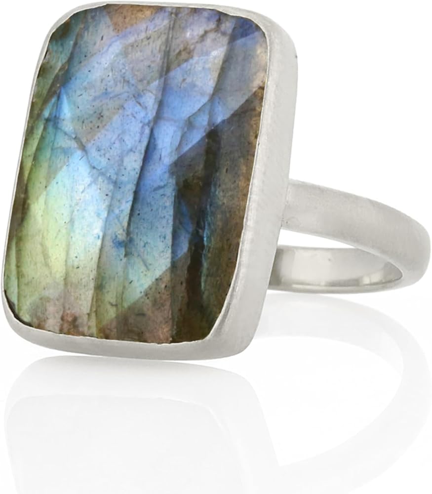 Immerse yourself in the mystical aura of this Silver Stackable Statement Ring. Featuring a prominent, rectangle-cut natural labradorite set in premium 925 sterling silver, this ring is a testament to quality and aesthetic. Labradorite is cherished for its remarkable play of color, known as labradorescence, and thought to ignite inner strength and intuition. Each labradorite is a piece of the night sky, shimmering with an ethereal light that makes each ring unique. The stackable design emphasizes versatility and expression, making this substantial ring an ideal statement piece for various occasions.