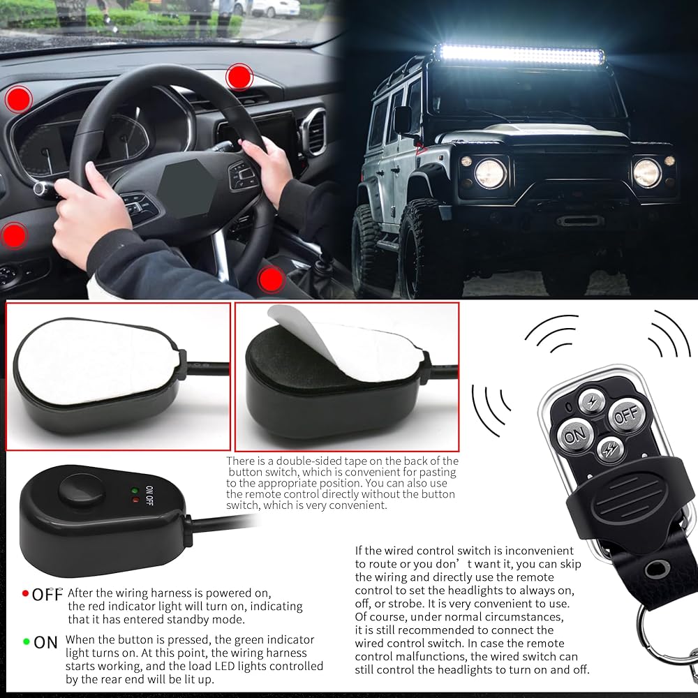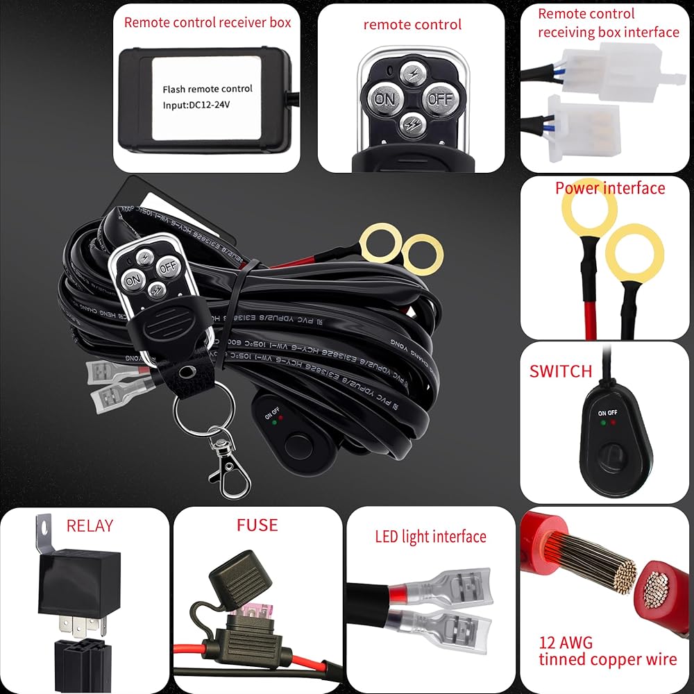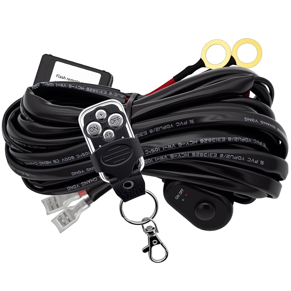 Professional-Grade Wiring Harness for LED Light Bars: This complete wiring harness kit provides a reliable and convenient power solution for your high-performance auxiliary lighting. Pre-assembled for easy installation, it connects directly to your battery and features a remote control for ultimate convenience.
