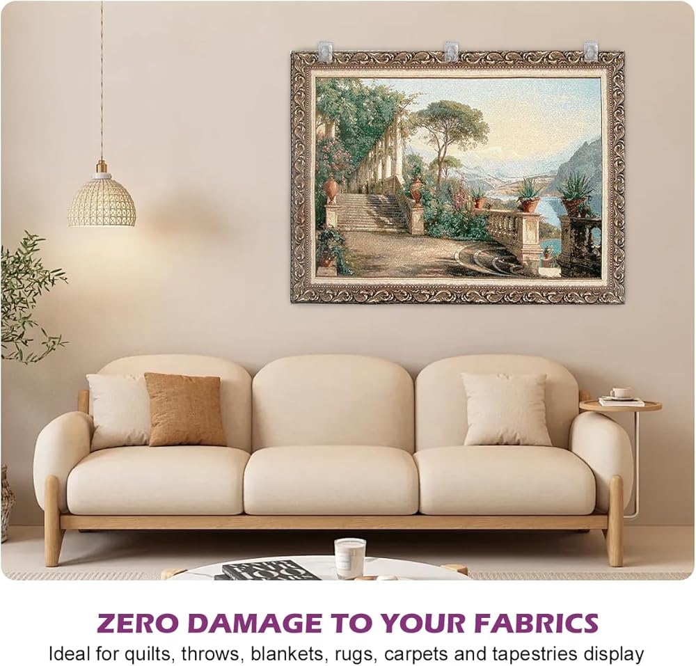 • سعة متعددة الاستخدامات وعالية الوزن: مثالية للألحف والرمي والبطانيات والسجاد والمفروشات بسمك أقل من 1 سم. عند تركيبها بشكل صحيح، يمكن لكل شماعة لحاف فردية دعم الحائط بما يصل إلى 5 كجم (11 رطلاً)، مما يوفر قوة موثوقة لمعظم منسوجات الديكور المنزلي.