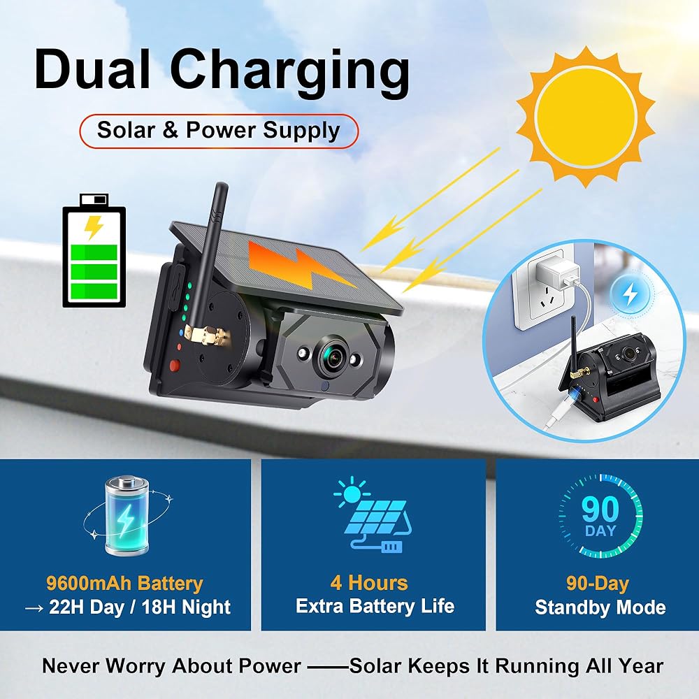 تشغيل بالطاقة الشمسية لمدة 22 ساعة: بطارية 9600 مللي أمبير في الساعة + لوحة شمسية 5.5 فولت 1 وات يتم شحنها بالكامل خلال ساعتين من ضوء الشمس؛ استخدام لمدة 22 ساعة في ضوء النهار/18 ساعة في الليل مع وضع الاستعداد لمدة 90 يومًا.