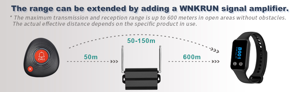 400FT RANGE & EXPANDABLE COVERAGE:The call button system can provide a reliable signal range of up to 400 feet in open areas(Obstacles or other objects may shorten the signal range).If the signal range is insufficient, you can add a signal amplifier from our store
