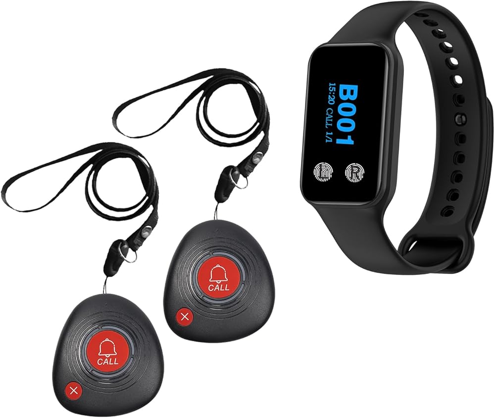 Wireless Call Button System Pager System 400ft Range 1 Waterproof Call Buttons & 1 Watch Receiver with Vibration Alert for Elderly Care Restaurant Bar Cafe Service