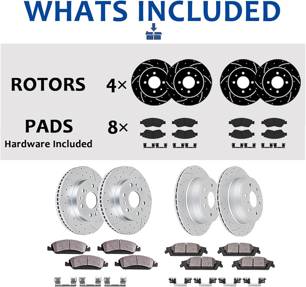 • Includes: 2x Front Drilled & Slotted Disc Brake Rotors (Front rotor size 296mm) - 31434; 4x Front Ceramic Brake Pads (Hardware Included) - D1293; 2x Rear Drilled & Slotted Disc Brake Rotors (Rear rotor size 281mm) - 31433; 4x Rear Ceramic Brake Pads (Hardware Included) - D1212