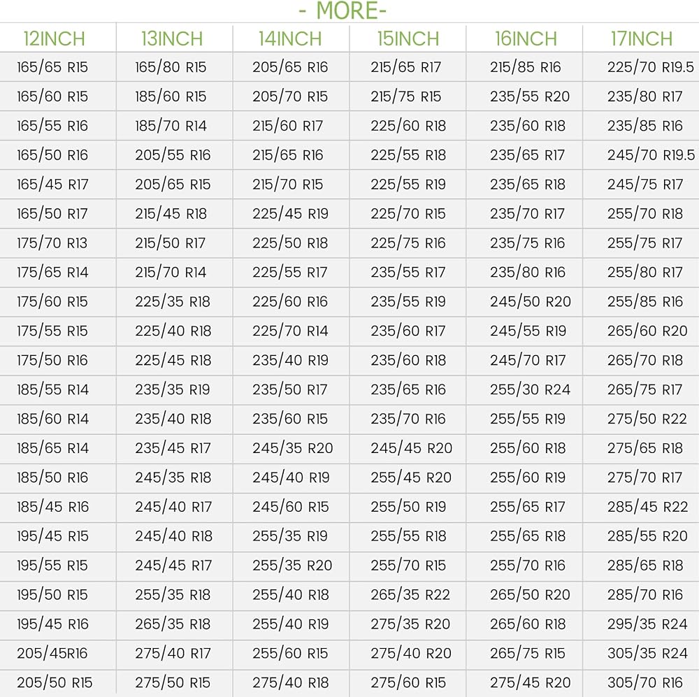 Please measure your tire before purchasing. 12 inch: Fits tire diameter 21”–23” (55–60 cm)