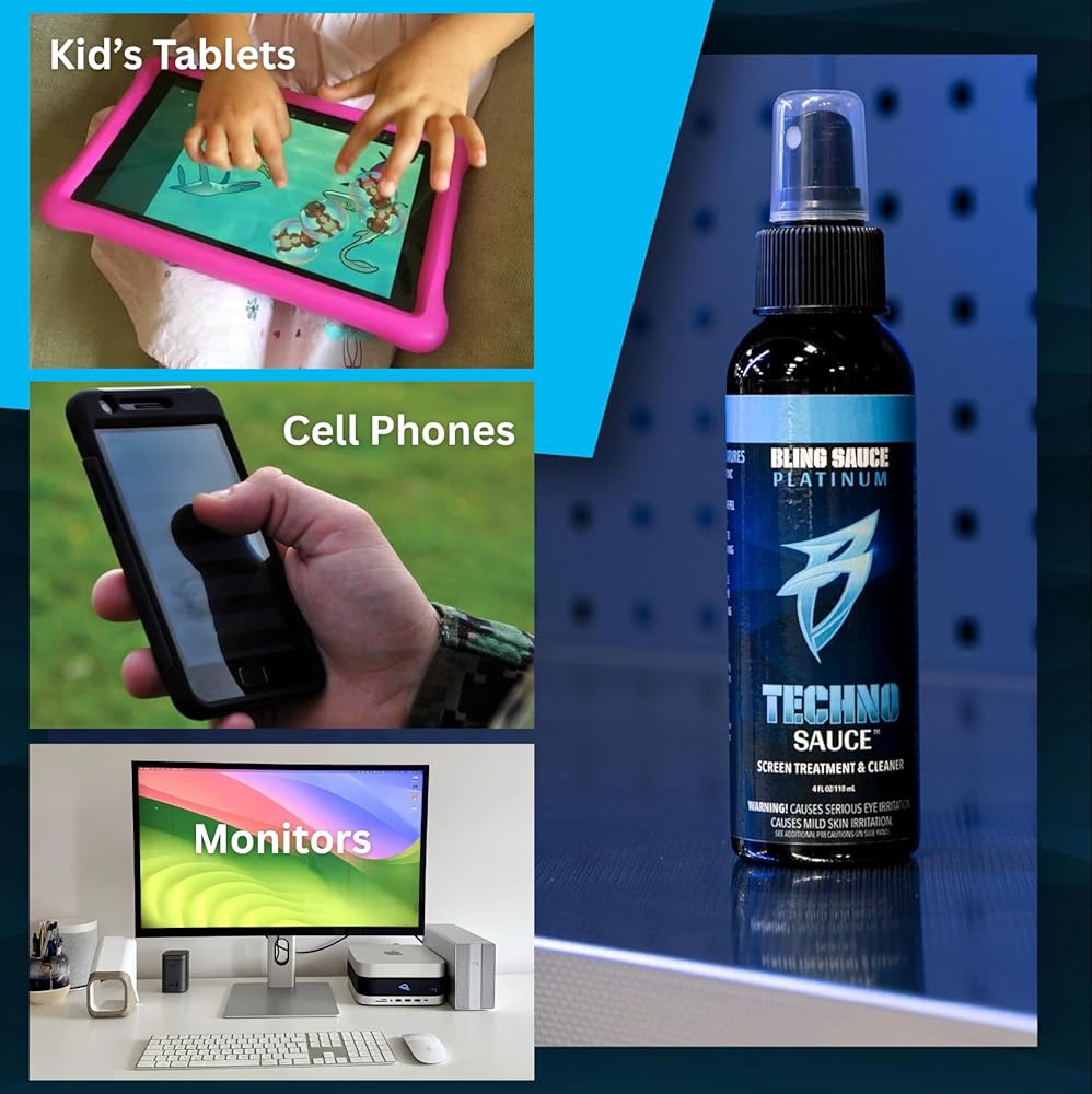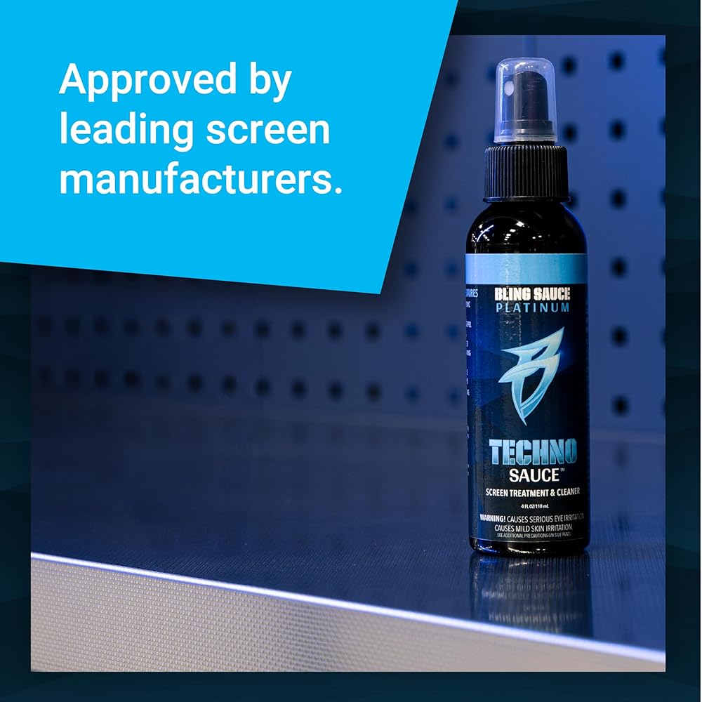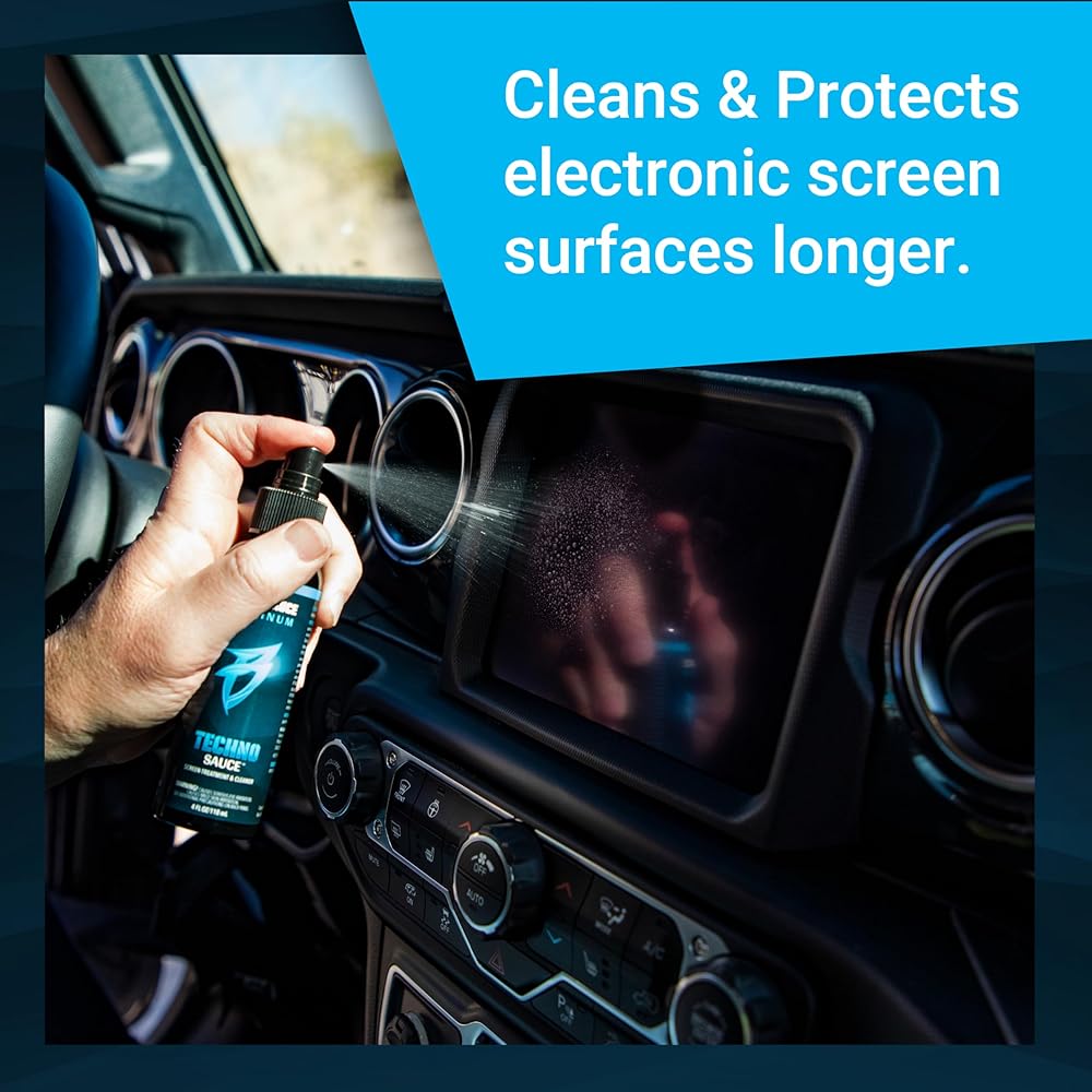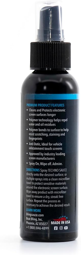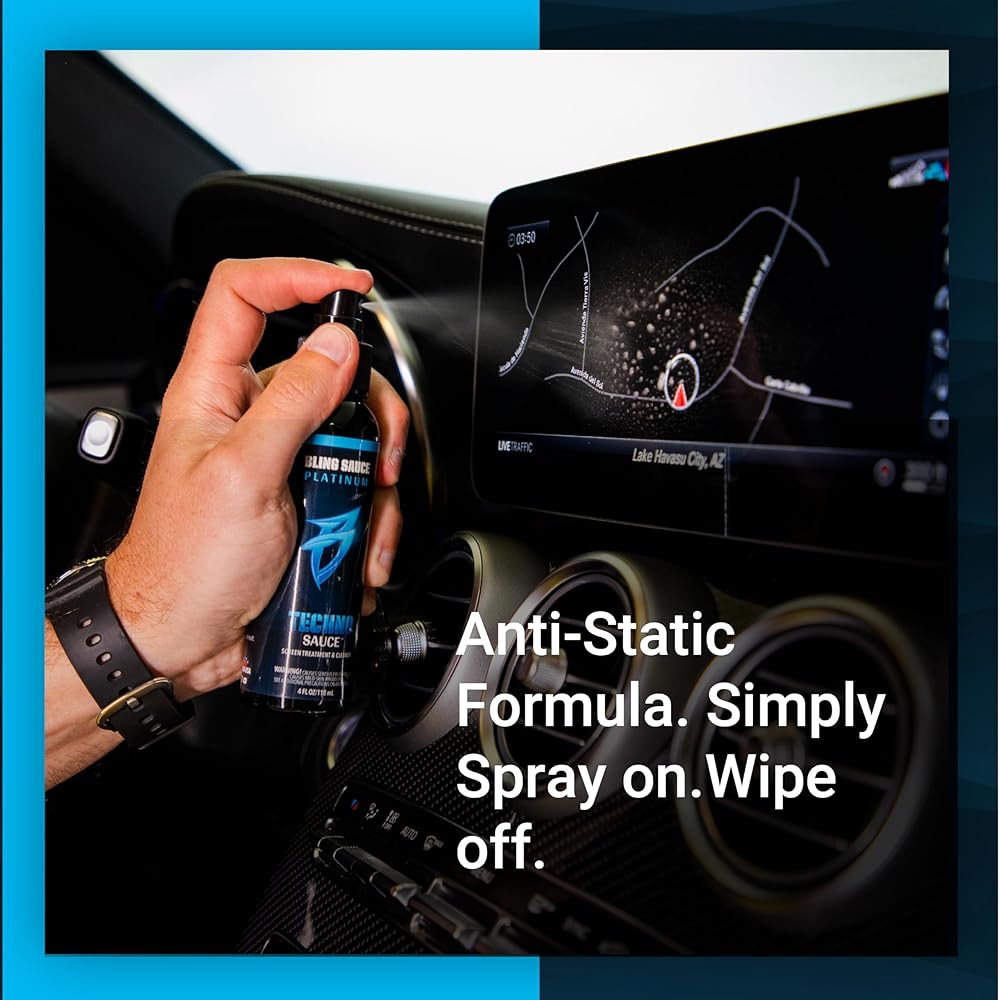 Keep your screens crystal clear with Techno Sauce by Bling Sauce — the ultimate anti-static screen cleaner and protector for your vehicle's infotainment system and electronic touchscreens. Specially engineered with advanced polymer technology, Techno Sauce doesn't just clean — it treats surfaces to help repel dust, fingerprints, smudges, water, and oil. The 2-in-1 formula bonds to your screens, providing longer-lasting resistance to scratching and staining. Simply spray on and wipe off for a clean that lasts. Whether you're tackling fingerprints on your dash or maintaining your tablet, Techno Sauce has you covered.