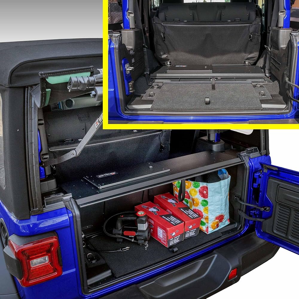 • MAXIMIZE YOUR CARGO SPACE - EZTrunk Security Box smartly re-invents your Wrangler's cargo space. It allows for full security when needed and folds flat in seconds allowing for the use of your full cargo area when needed. No need to unscrew, loosen, unbolt, simply fold down with our patented design.