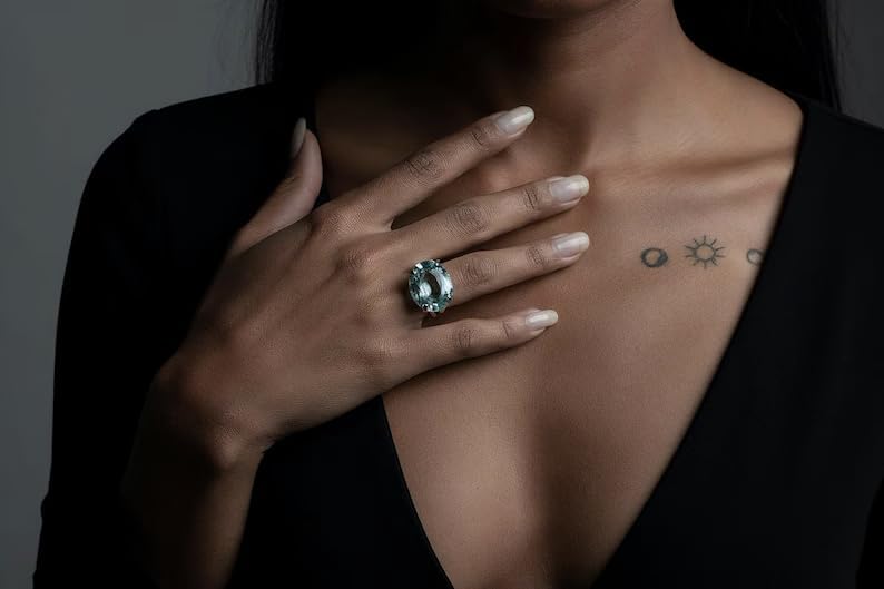 This blue topaz rose gold ring captures refined beauty with its oval-cut faceted gemstone. Crafted in 14k rose gold filled metal, it blends soft pink tones with the cool brilliance of blue topaz for a striking contrast. A handmade statement piece perfect for elegant evenings or as a thoughtful gift for someone special.