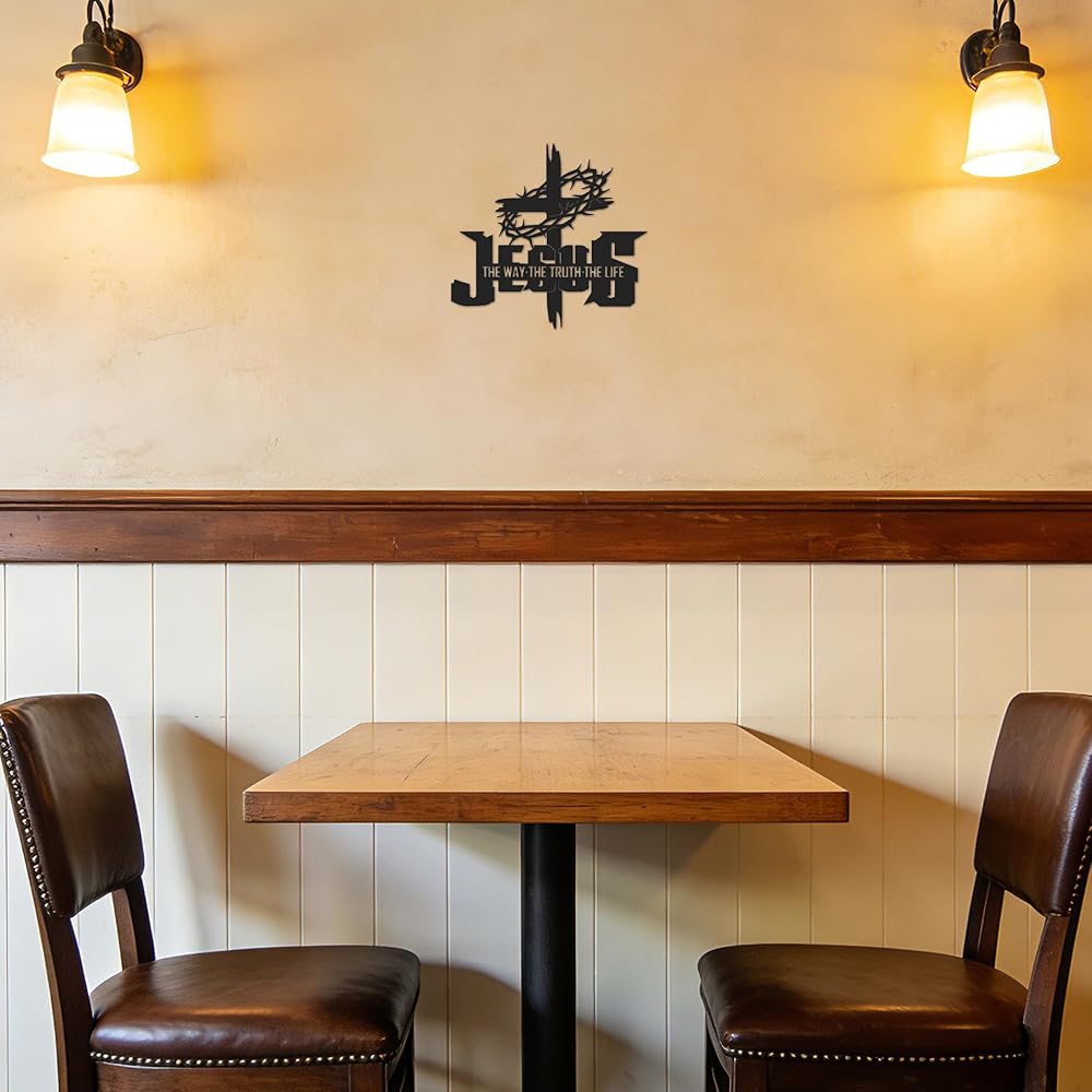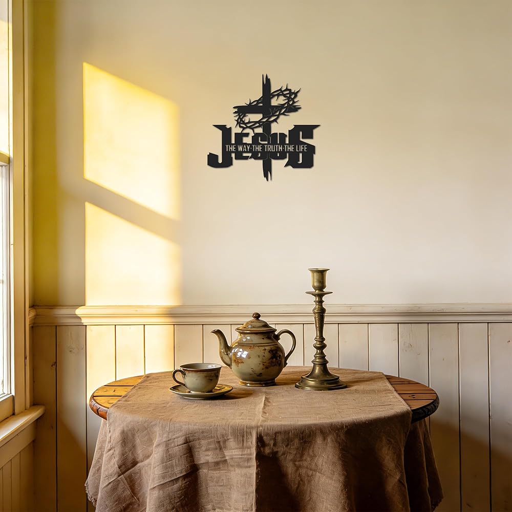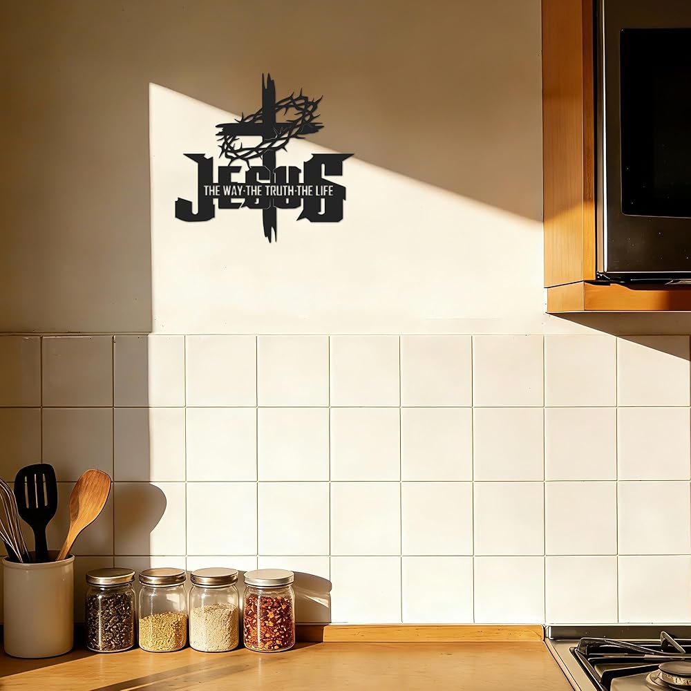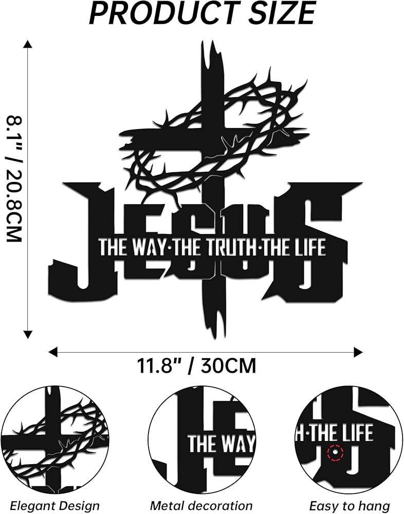 Symbolic Thorned Cross Design: This reverent metal wall art features a detailed cross intertwined with thorns, positioned above the word “JESUSD” which contains the powerful scripture “THE WAY THE TRUTH THE LIFE”. This design symbolizes sacrifice, devotion, and eternal truth, bringing a profound sense of sacred presence to your space of worship or reflection.