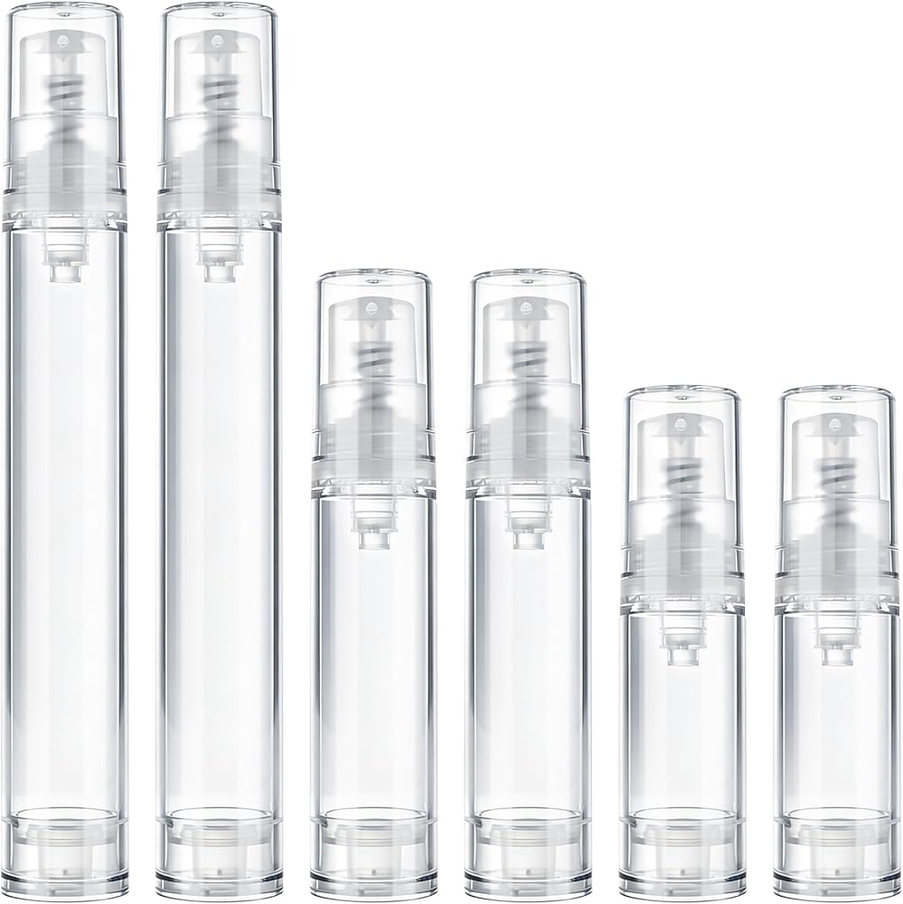 Hzopcw 6pcs Airless Travel Pump Bottle, Empty Refillable Vacuum Pump Bottle, 5ml 10ml 15ml Plastic Press Lotion Travel Container for DIY Cosmetic Foundation Toiletries- Clear