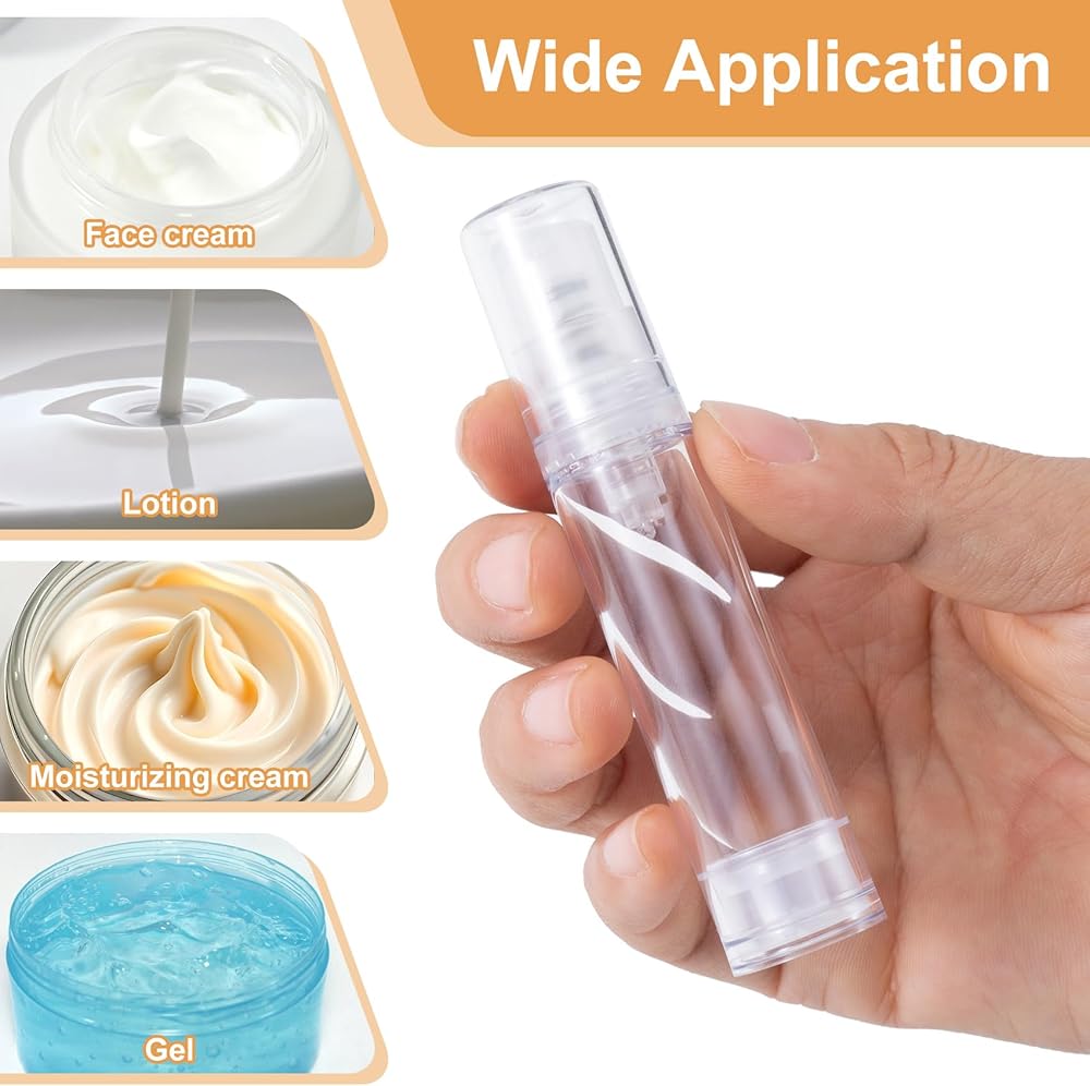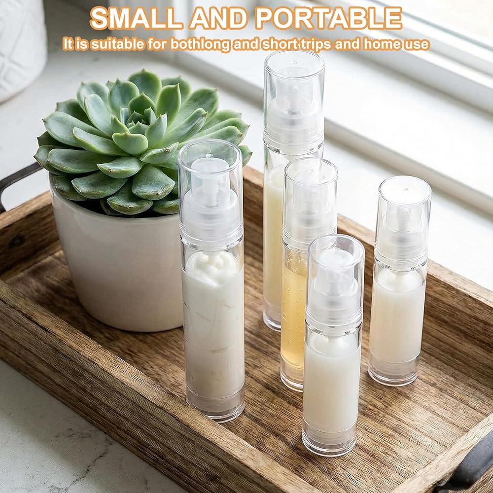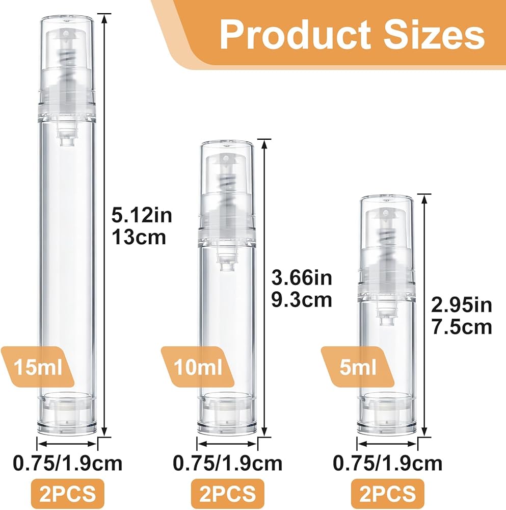 3 Sizes: These airless pump bottles come with 3 sizes, including 15ml:0.75x5.12in, 10ml:0.75x3.66in, 5ml:0.75x2.95in. You can choose the suitable size according to your cosmetic capacity needs, ensuring the travel size pump bottle fits your bag or luggage for easy carrying.