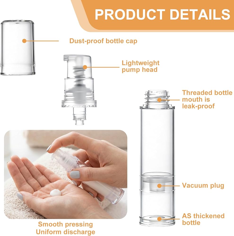 Unique Design: This airless pump container is designed with dust-proof bottle cap, lightweight pump head, threaded leak-proof bottle mouth, vacuum plug and smooth pressing feature. You can keep your cosmetics clean and avoid leaks during use, making the travel pump bottle more reliable for daily and travel use.