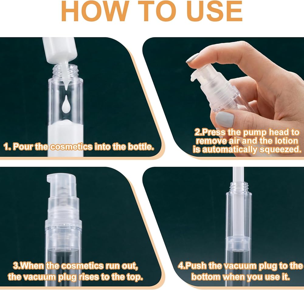How to Use: These airless travel pump bottles are easy to apply with simple steps. Pour the cosmetics into the bottle, press the pump head to remove air and the lotion is automatically squeezed. Then the vacuum plug rises to the top when the cosmetics run out, push the vacuum plug to the bottom when you use it again.