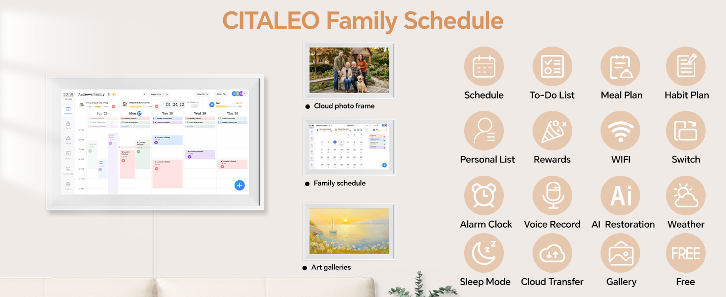 • 3 أوضاع في مخطط جدول واحد: وضع الجدول الزمني: التخطيط اليومي الرئيسي والتنسيق العائلي. وضع المعرض الفني: يعرض التقويم الذكي للجدار مجموعة دوارة مدمجة من الأعمال الفنية الكلاسيكية وخلفيات الشاشة الديناميكية - لا حاجة لتنزيل أي شيء. وضع ألبوم الصور السحابي: مركز الذاكرة العائلية الحية. انقل صورك المفضلة على الفور من أي مكان مباشرةً إلى شاشة تقويم Google، وحوّلها إلى إطار صور رقمي ذكي. لا توجد رسوم إضافية