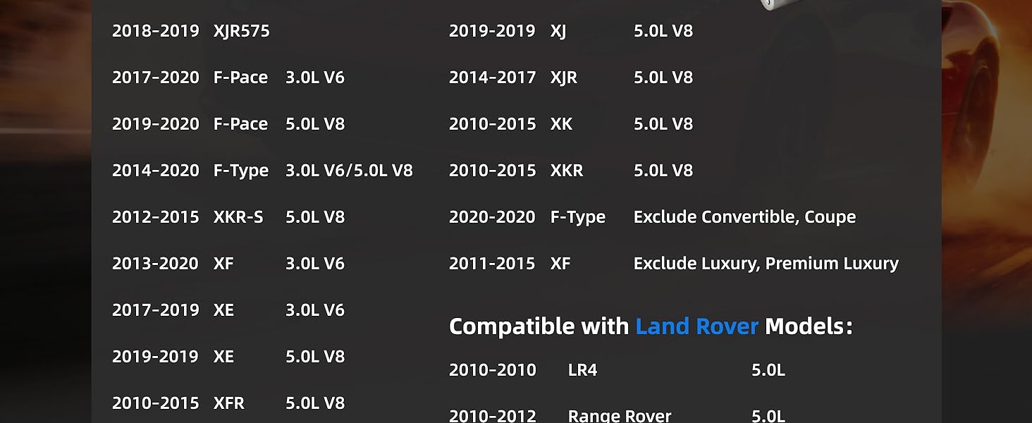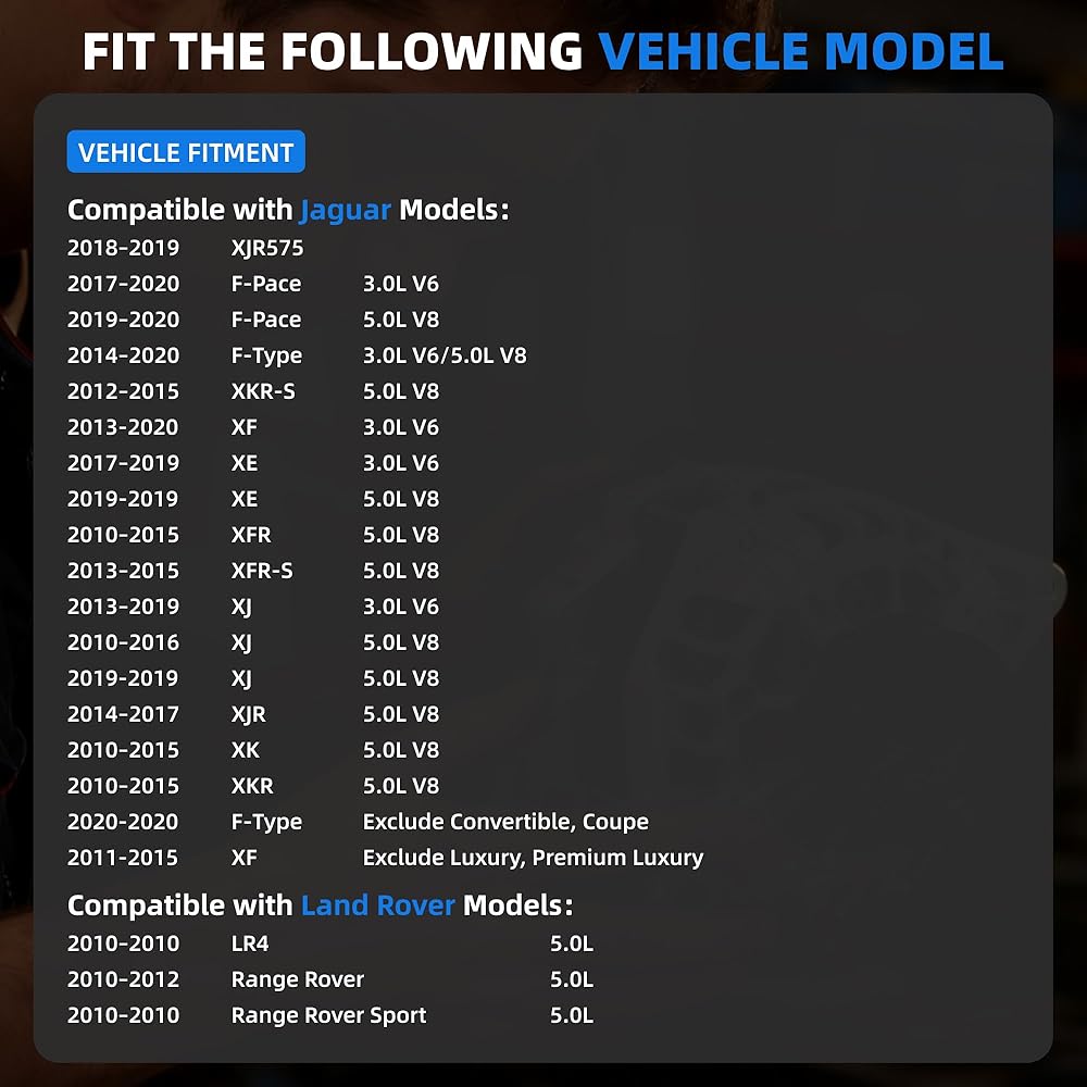【Durability & Reliability】: Manufactured with high-quality materials and subjected to rigorous no-load, load, and full-quality testing. Designed specifically compatible with 2010 Land Rover LR4,Jaguar F-Pace: 2017–2020 3.0L V6 / 2019–2022 5.0L V8,F-Type: 2014–2019 3.0L V6 / 5.0L V8, 2020 (Exclude Convertible, Coupe),XE: 2017–2019 3.0L V6 / 2019 5.0L V8,XF: 2011–2015 5.0L V8 (Exclude Luxury, Premium Luxury) / 2013–2020 3.0L V6,XFR: 2010–2015 V8 5.0L,XFR-S: 2013–2015 V8 5.0L,XJ: 2013–2019 V6 3.0L. Verify your vehicle details and part number for a perfect, hassle-free fitment