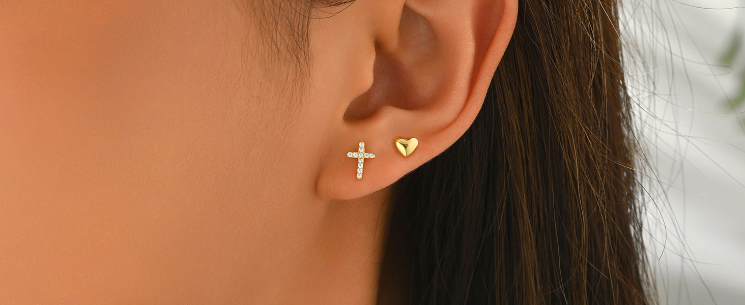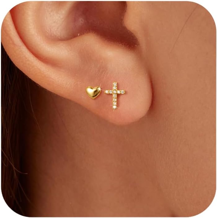 Tiny Cross Heart Earrings for Women 925 Sterling Silver Mini Cubic Zirconia Asymmetrical Stud Earring Dainty 14k Gold Plated Christian Religious Faith Cartilage Earring Jewelry Gifts
