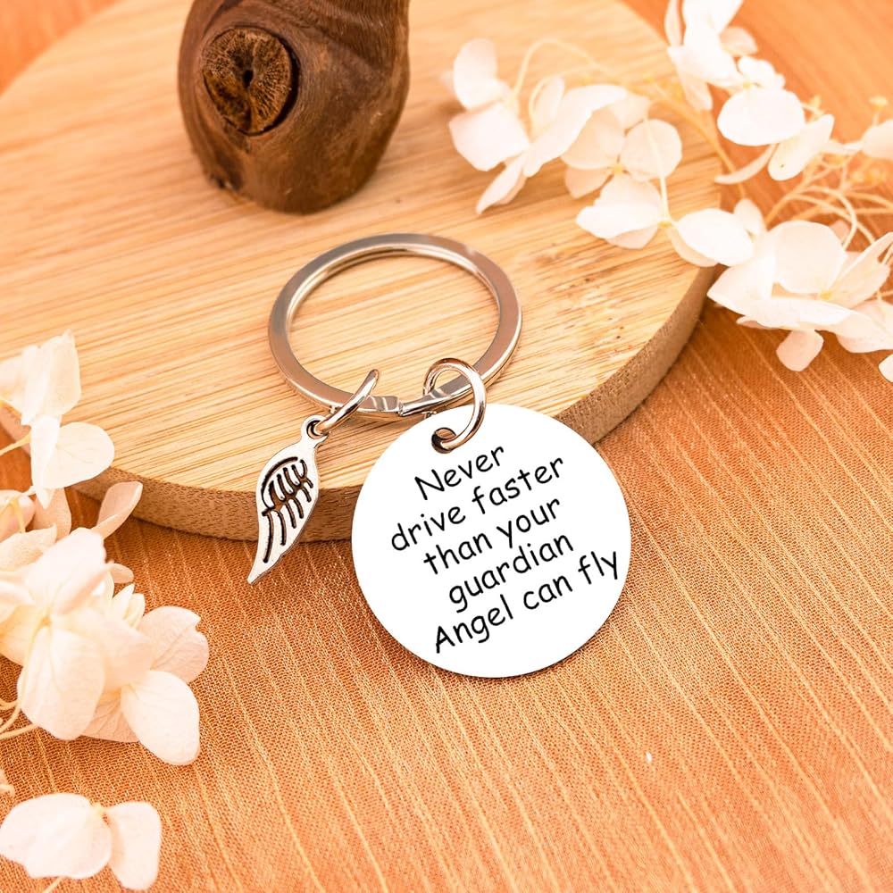 Angel Keychain & Gift New Driver :This Meaningful Keychain Features Safety Message Never Drive Faster Than Your Guardian Angel Can Fly With Delicate Wings Design Creating Perfect Guardian Angel Gift For Drivers