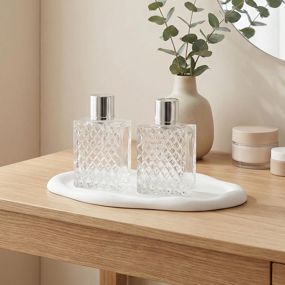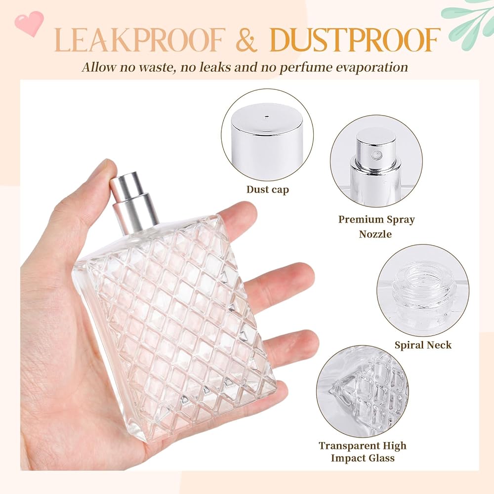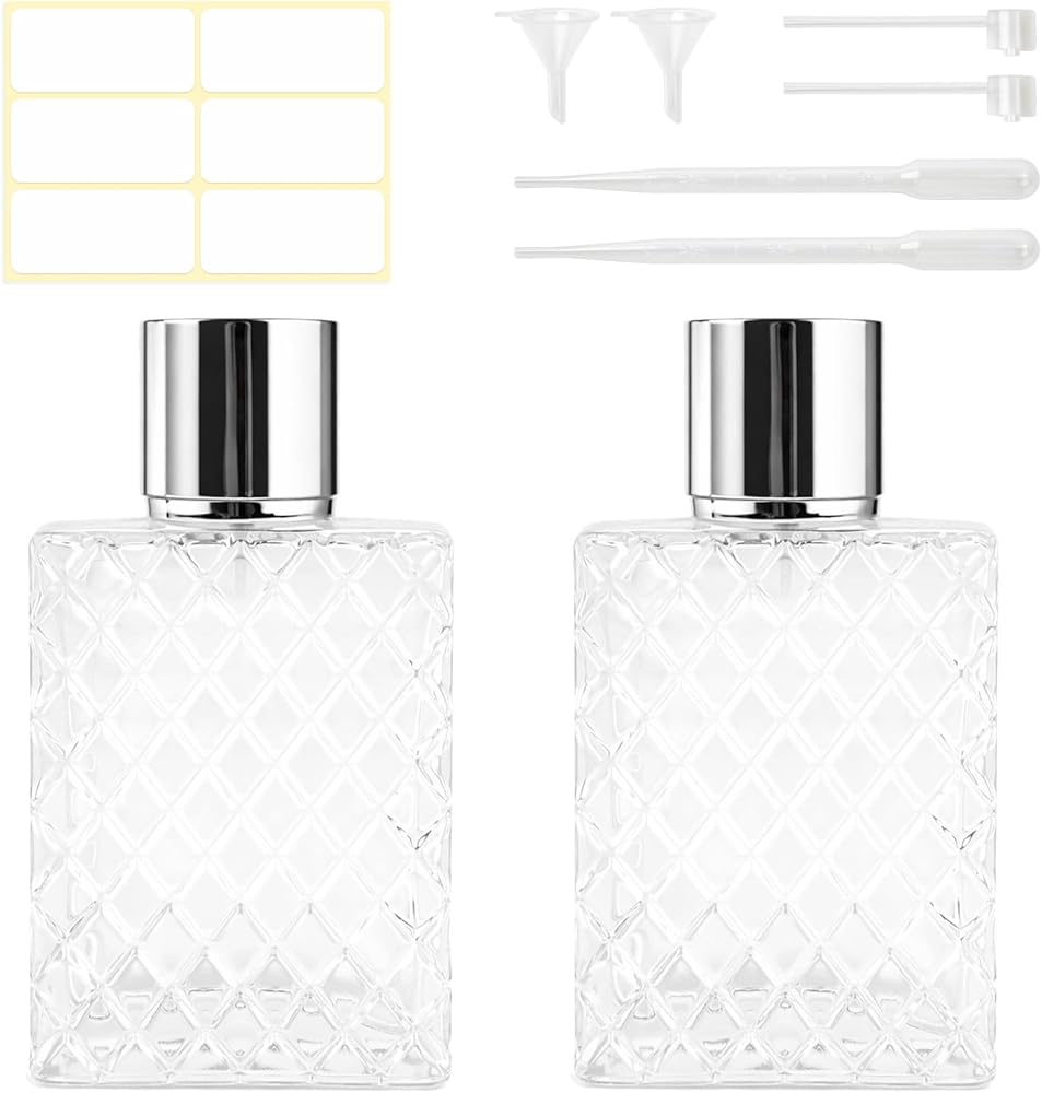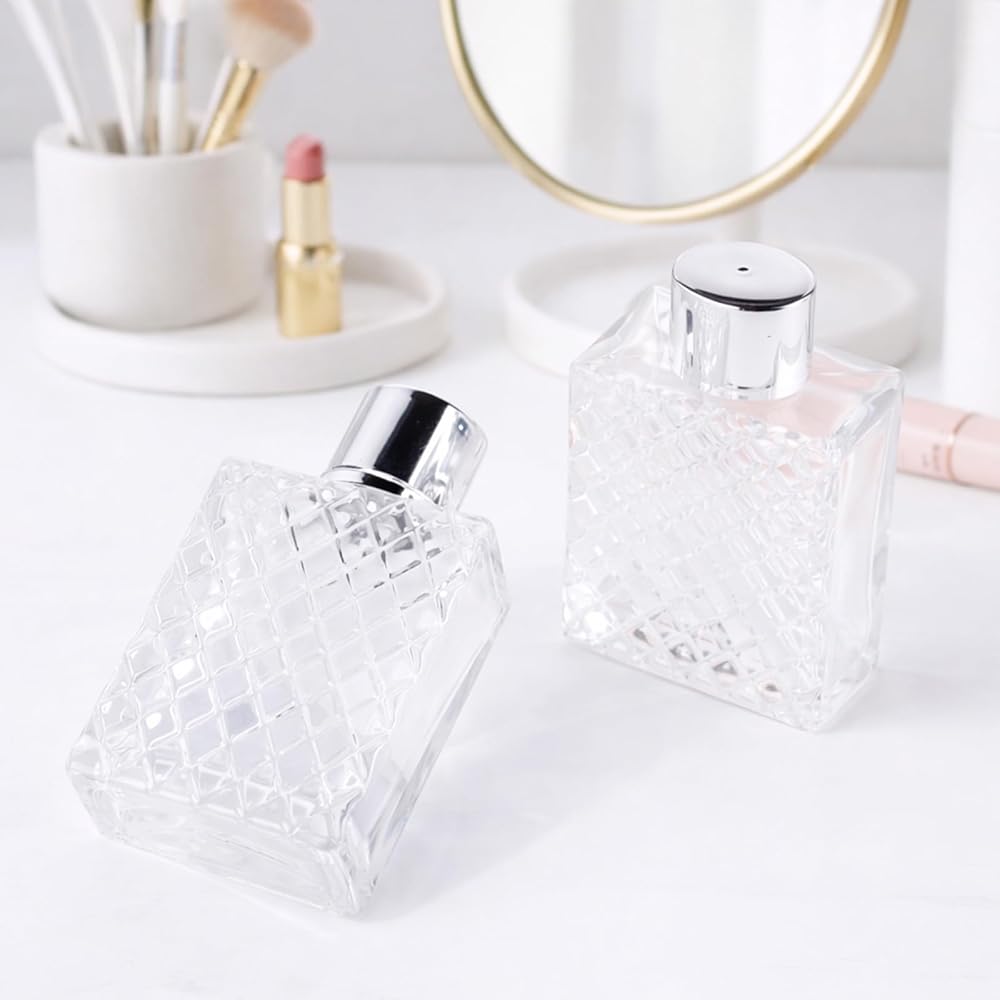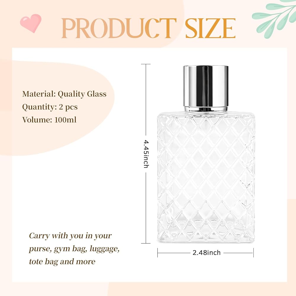 This perfume bottle set includes 2 pack 100ml premium clear glass perfume bottles, featuring a timeless and sophisticated design. Their crystal-clear transparency beautifully showcases your fragrance, while the sleek silhouette adds a touch of luxury to any vanity or collection. Perfect for perfume enthusiasts who value both elegance and functionality in their accessories.