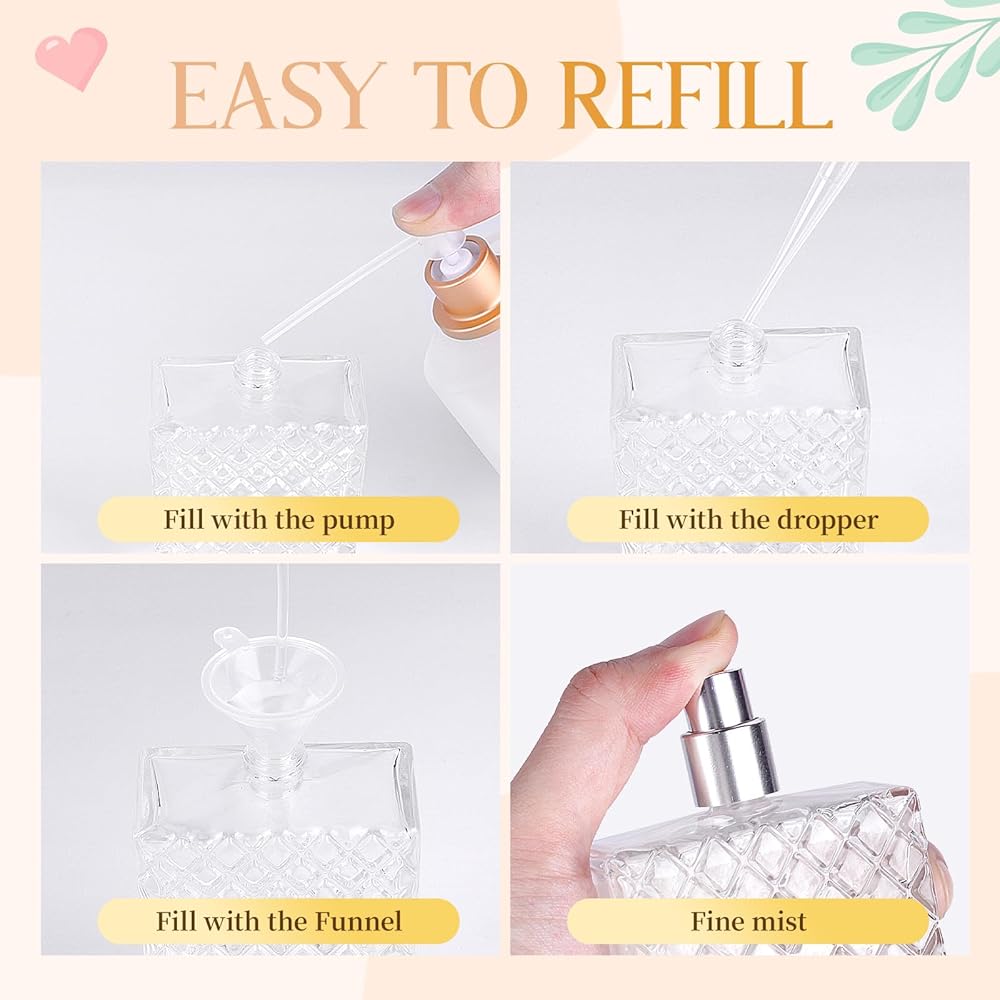 • Elegant & Stylish Glass Bottles : This perfume bottle set includes 2 pack 100ml premium clear glass perfume bottles, featuring a timeless and sophisticated design. Their crystal-clear transparency beautifully showcases your fragrance, while the sleek silhouette adds a touch of luxury to any vanity or collection. Perfect for perfume enthusiasts who value both elegance and functionality in their accessories.