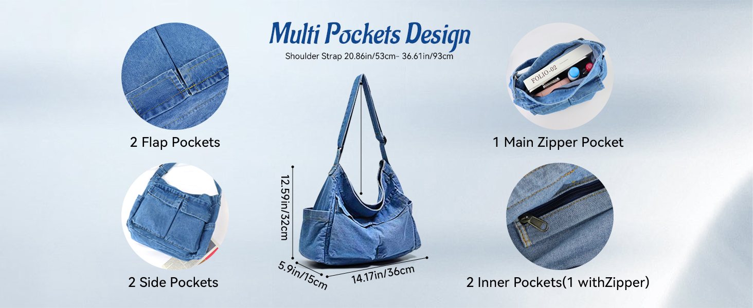 تصميم متعدد الاستخدامات: حقيبة الكتف الكبيرة هذه مناسبة لمختلف المناسبات مثل التنقل اليومي والسفر في عطلة نهاية الأسبوع والنزهات الترفيهية. يمكن أن تتناسب درجة لون الدنيم المحايدة بسهولة مع مجموعة متنوعة من أنماط الملابس، بدءًا من ملابس الشارع وحتى الطراز البوهيمي