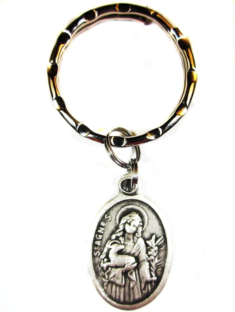 1" oxidized medal on a 1" hammered key ring. Patronage girls, Girl Scouts, engaged couples, gardeners. St Agnes Prayer card included, image from card shown.