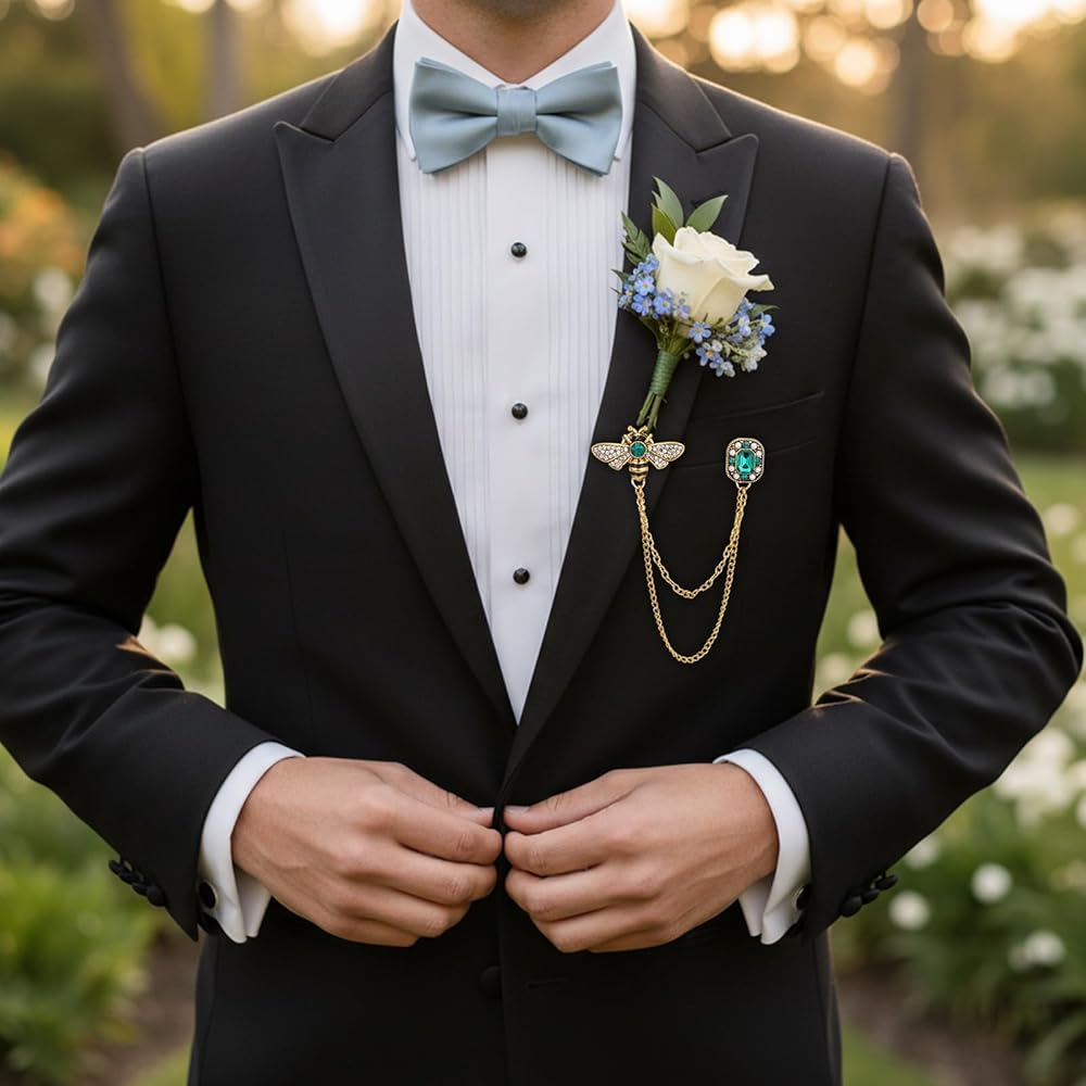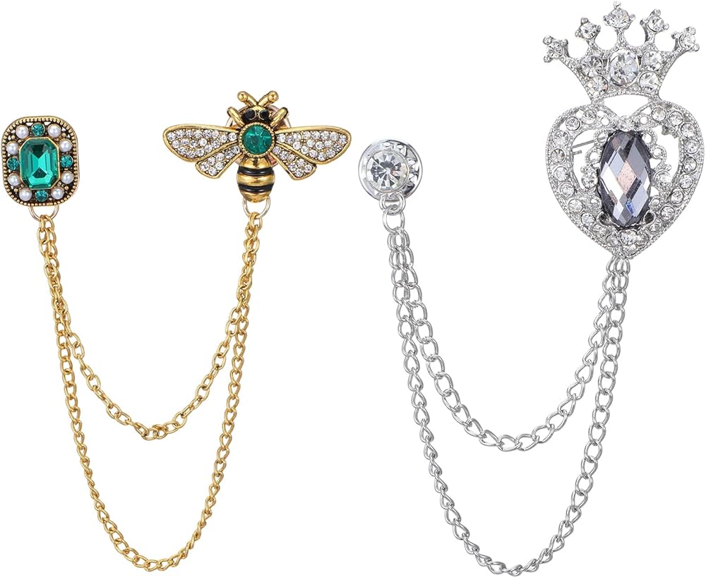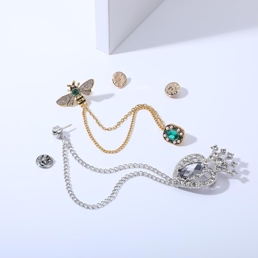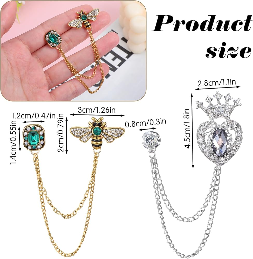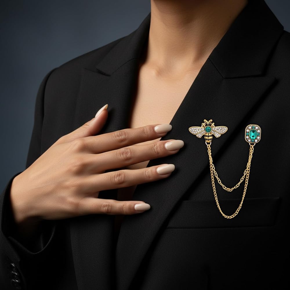 • Retro Design: This vintage-style lapel pin features a detailed honey bee design adorned with sparkling rhinestones, a green gemstone accent, and a dangling crown charm on a fine chain. Combining silver, gold, and green tones, it creates a whimsical yet elegant look. This distinctive design acts as a unique, conversation-starting accessory that adds personality and a touch of antique charm to any outfit, suitable for both daily wear and special occasions