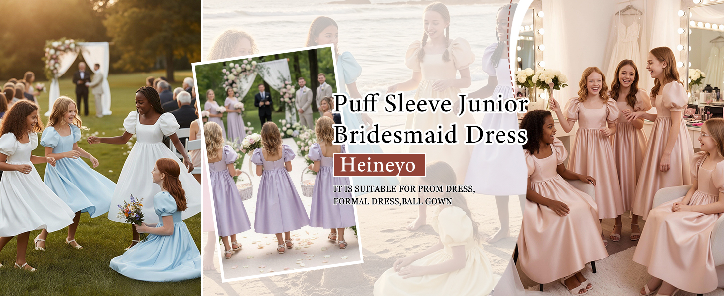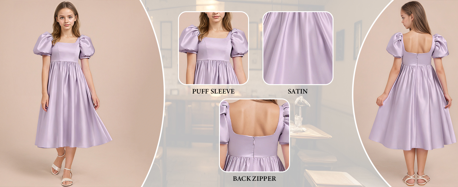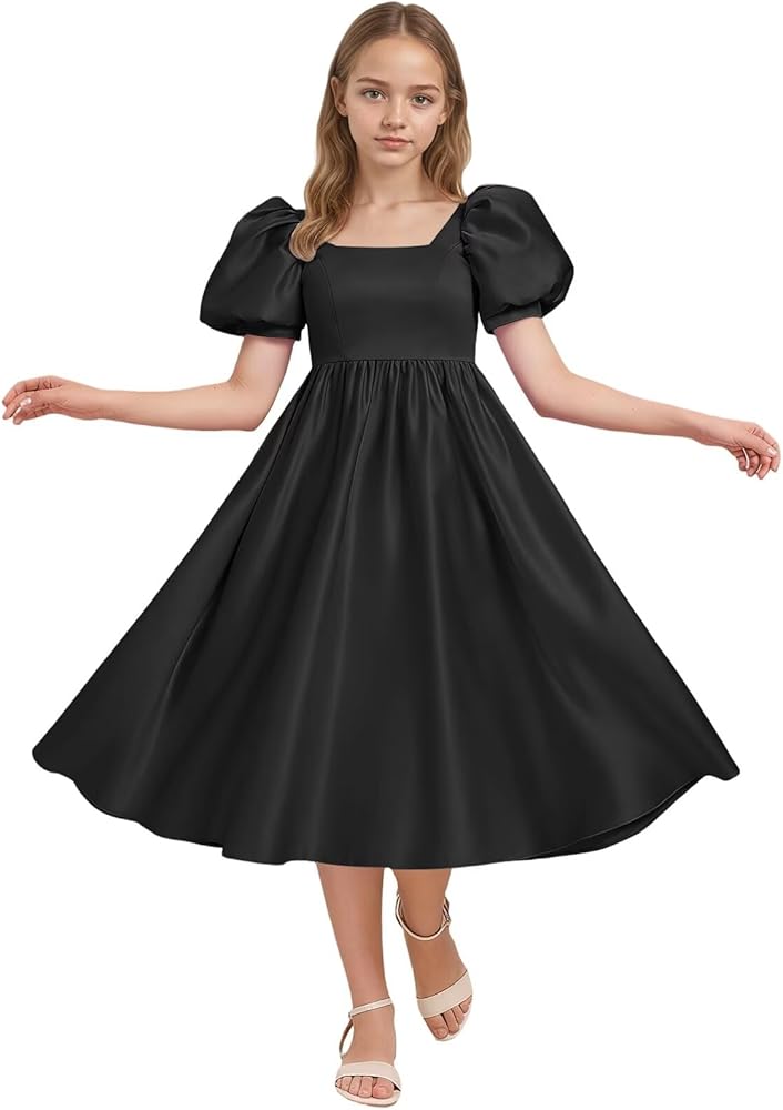 فستان وصيفة العروس جونيور بأكمام منتفخة ورقبة مربعة لحفلات أعياد الميلاد وحفلات الزفاف من الساتان فساتين طويلة لضيوف الزفاف in Kuwait
