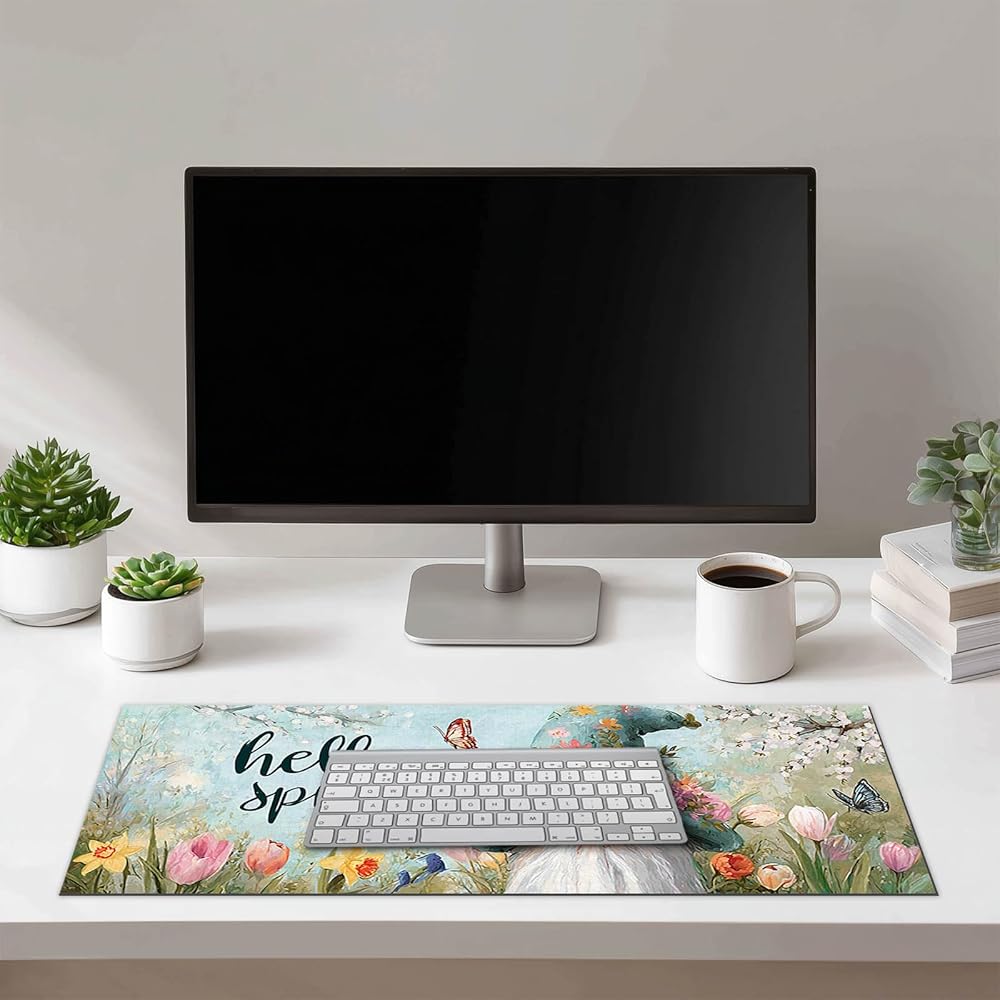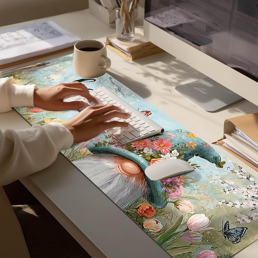 Welcome the season of renewal with this spring-themed large mouse pad featuring a charming gnome crowned with flowers, fluttering butterflies, and blooming tulips. The gentle color palette and hand-painted style create a light, refreshing atmosphere for your home office or workspace. Crafted with a smooth fabric surface and a non-slip rubber base, this desk mat offers both comfort and control for everyday computer use. Whether you're decorating for spring or upgrading your setup, this mouse pad blends functionality with delightful seasonal décor.