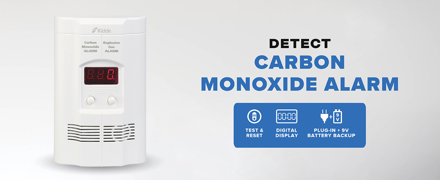 The Kidde Carbon Monoxide Detector, Propane, Natural, & Explosive Gas Alarm, Plug-In Wall with 9-Volt Battery Backup, Digital LED Display uses electrochemical sensor technology to detect poisonous carbon monoxide, methane gas, sewer gas, propane gas or natural gas in your home and alerts you by sounding an 85-decibel alarm & displaying the amount of carbon monoxide detected or stating "gas" on the digital display when detecting explosive gas. Setup is easy as the Kidde carbon monoxide alarm plugs into a standard, 120V AC power outlet in your home, while a 9-volt alkaline battery (included) works as a backup in the event of a power failure. When carbon monoxide is detected, the digital display shows the level of carbon monoxide the alarm is sensing and updates every 15 seconds. Peak Level Memory records the last time carbon monoxide was detected or when the unit was tested. The Smart-Hush button silences the unit for approximately 8 minutes, which is helpful when this smoke detector carbon monoxide detector combo sounds from things like routine cooking or shower steam. Extension cord (included) allows for placement on a table or shelf. Install a carbon monoxide detector on every level of your home and near bedrooms to keep your family safe. UL certified with a 6-year warranty. Meets UL 2034 and UL 1484.