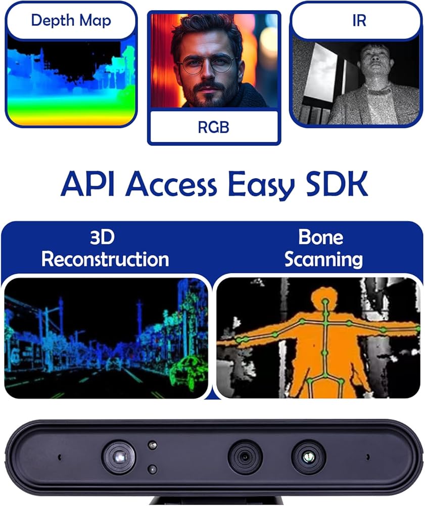 Lab-Grade Indoor Accuracy, ±3mm at 1m – Achieve sub-millimeter precision with structured light technology. Perfect for 3D modeling, VR AR gesture recognition, and AI vision tasks. Zero blind spot measurements in controlled lab, warehouse, or industrial settings. long-range (8m) for logistics or high-res RGB (1280x720) for enhanced visual data. 3d camera outputs include point clouds, depth maps, IR, and RGB.