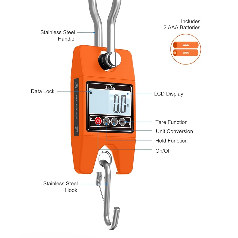 【Portability】Designed for portability, the Hanging Weight Scale is equipped with 2 AAA batteries and a data lock to ensure that the values will not change. It can be easily used for weighing equipment during camping trips or for meal control in the kitchen.