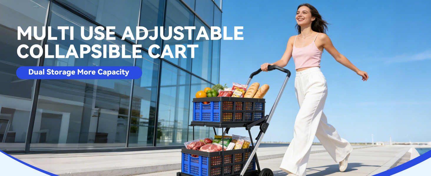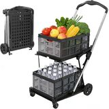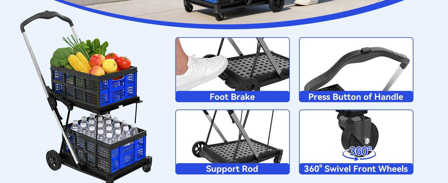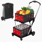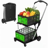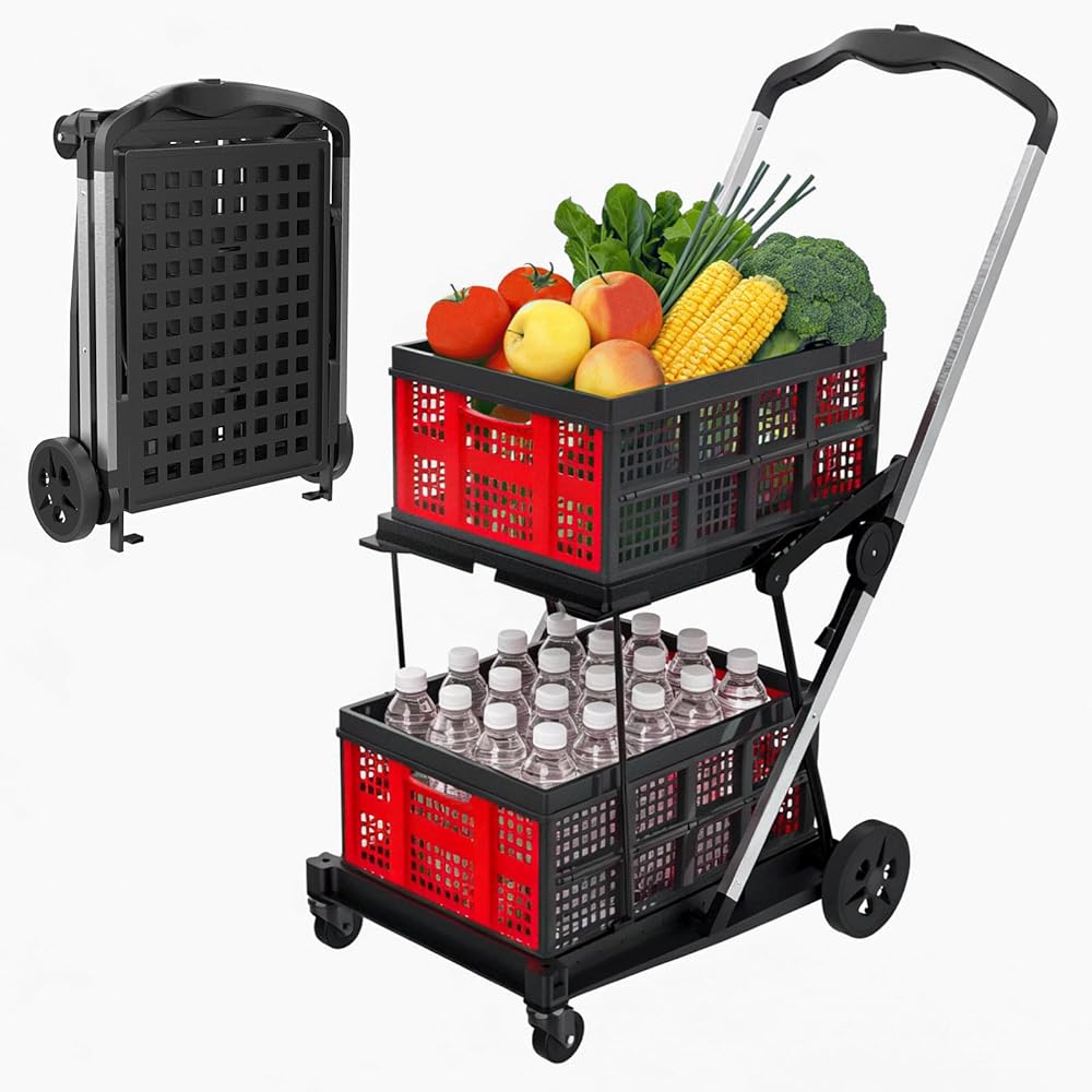 SPACE-SAVING: Our folding shopping cart allows you to easily unfold and fold the shopping cart by simply pressing the handle button; Cart and crates fold flat when not in use, making it compact and easy to store in tight spaces like closets or car trunks