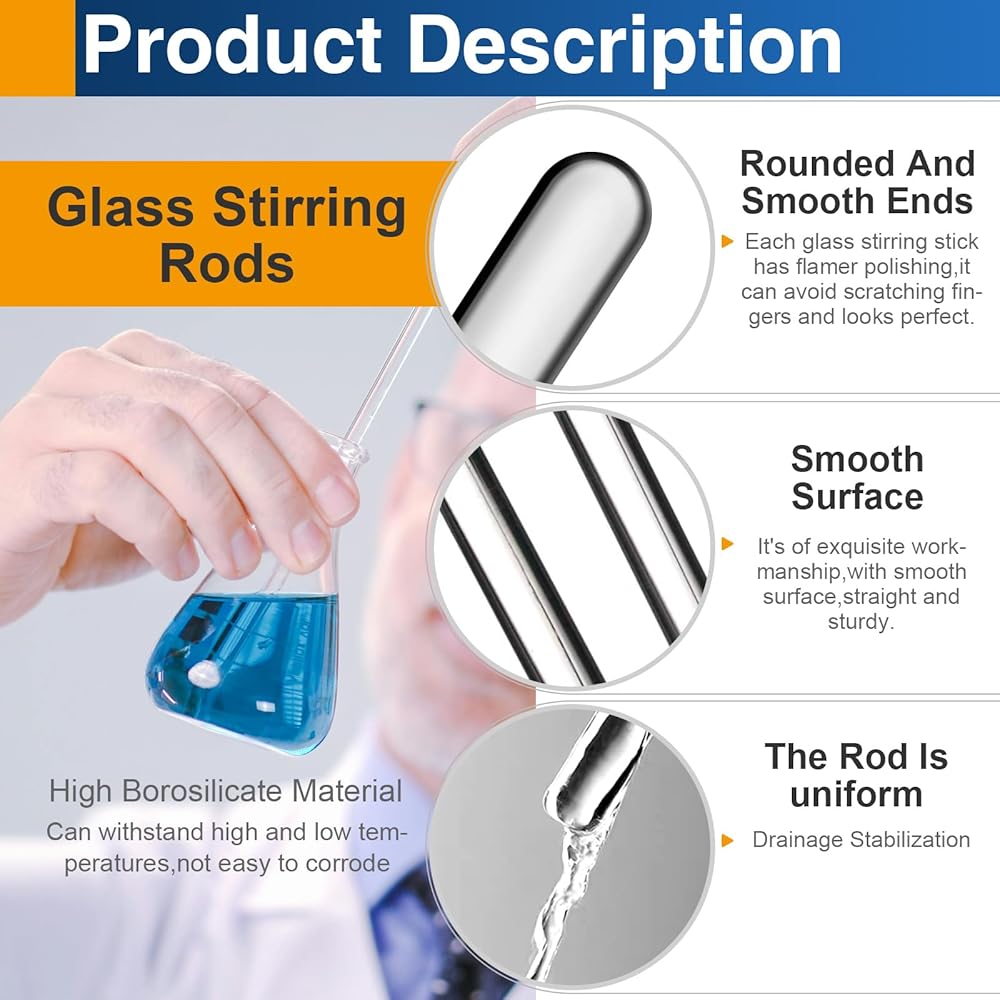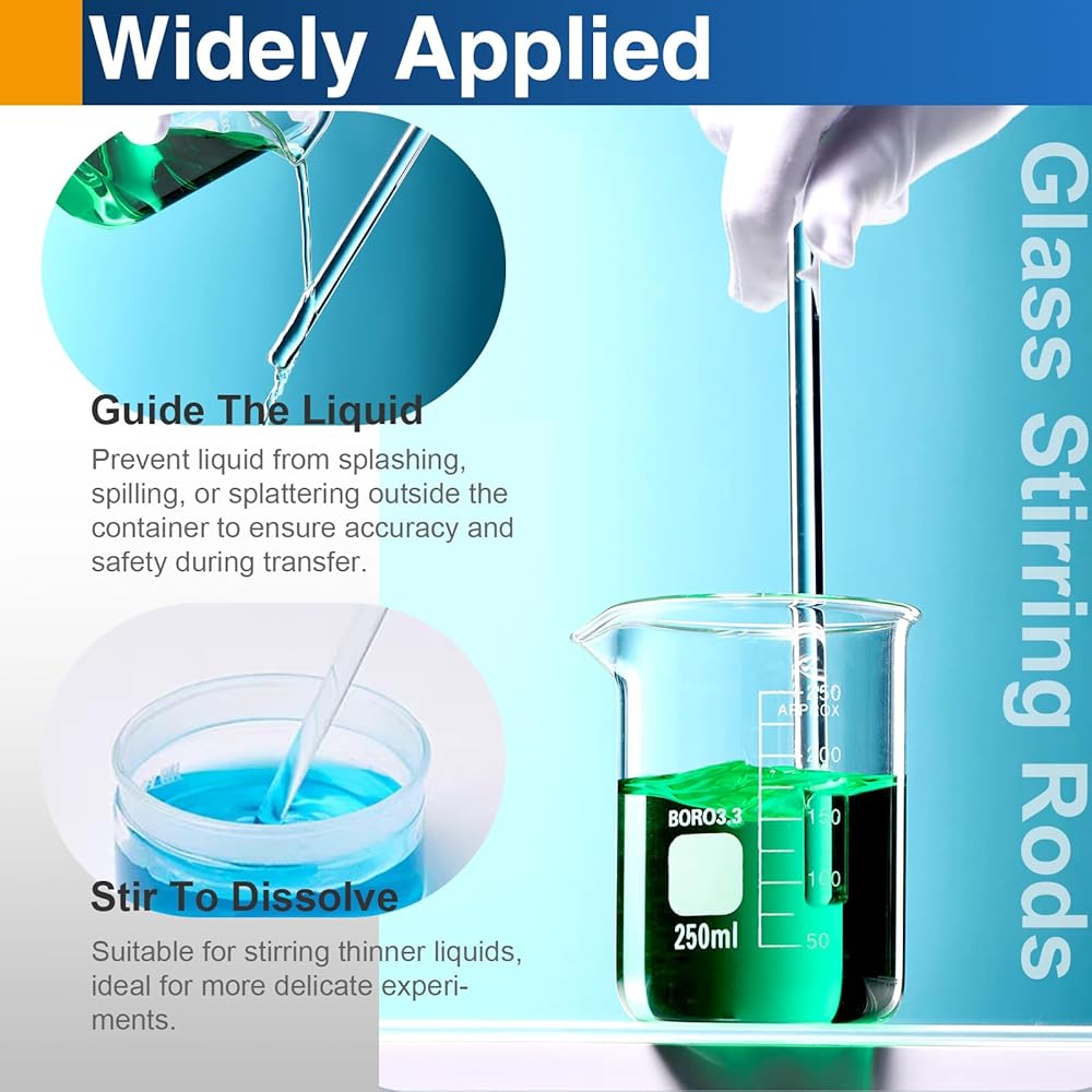 • Premium Borosilicate Glass:Crafted from professional high borosilicate glass, these stirring rods offer exceptional durability and heat resistance, withstanding temperatures up to 297°F without cracking or scratching surfaces—ideal for both laboratory experiments and kitchen use
