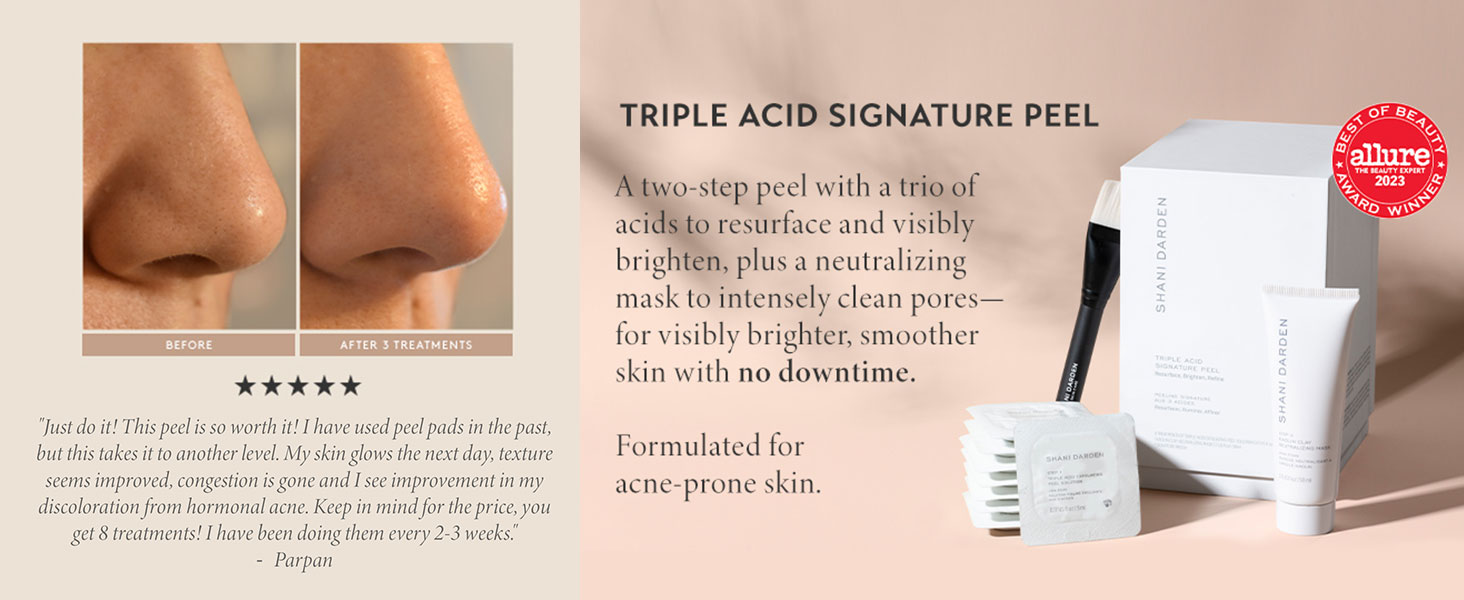 شاني داردن مقشر الأحماض الثلاثية. مقشر قوي مجدد للسطح في خطوتين يزيل الجلد الميت وينظف المسام، مما يترك بشرتك أكثر نعومة. احصل على السجادة الحمراء جاهزة في دقائق.