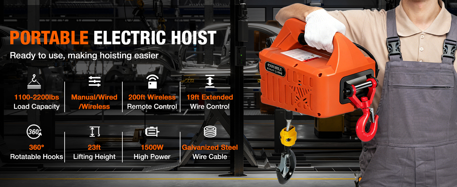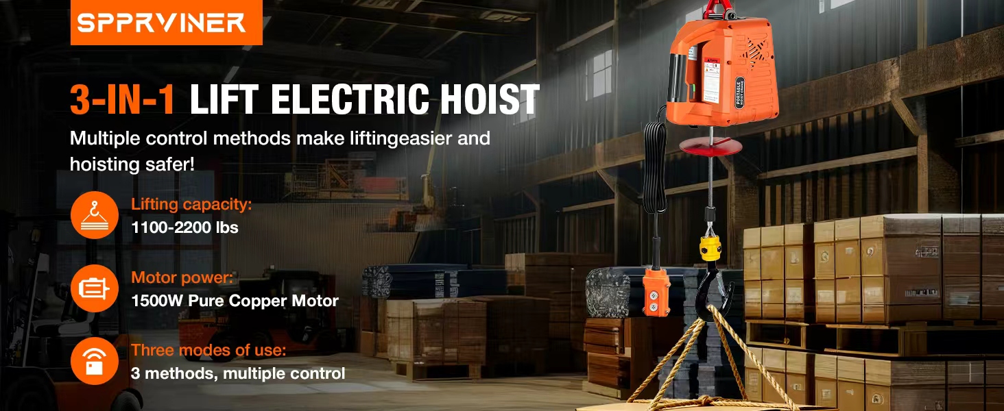 【1500W PEAK POWER MOTOR】 – Built for heavy lifting. Delivers 2200lb capacity with 13ft/min lift speed and 41ft max height. Reliable power for the toughest jobs.