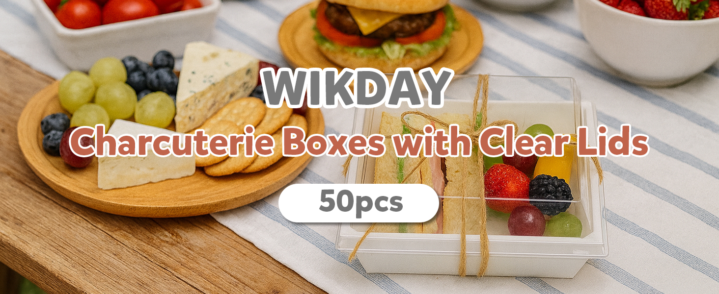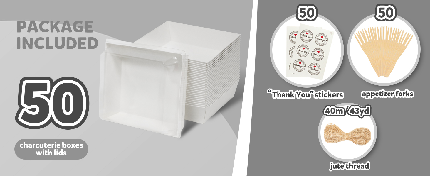 PACKAGE INCLUDED: You will get 50 charcuterie boxes with 50 clear lids, 50 forks, sufficient "Thank You" stickers and twine, providing a complete and thoughtful package