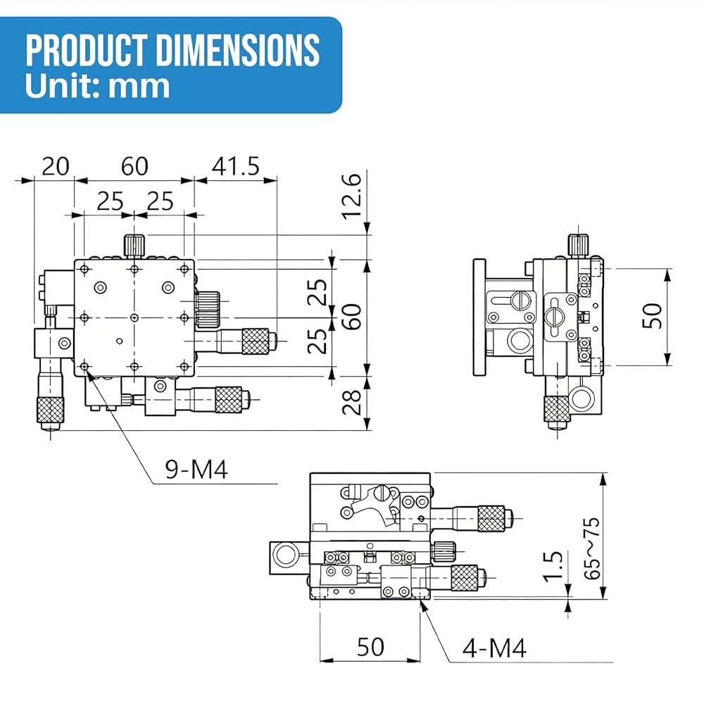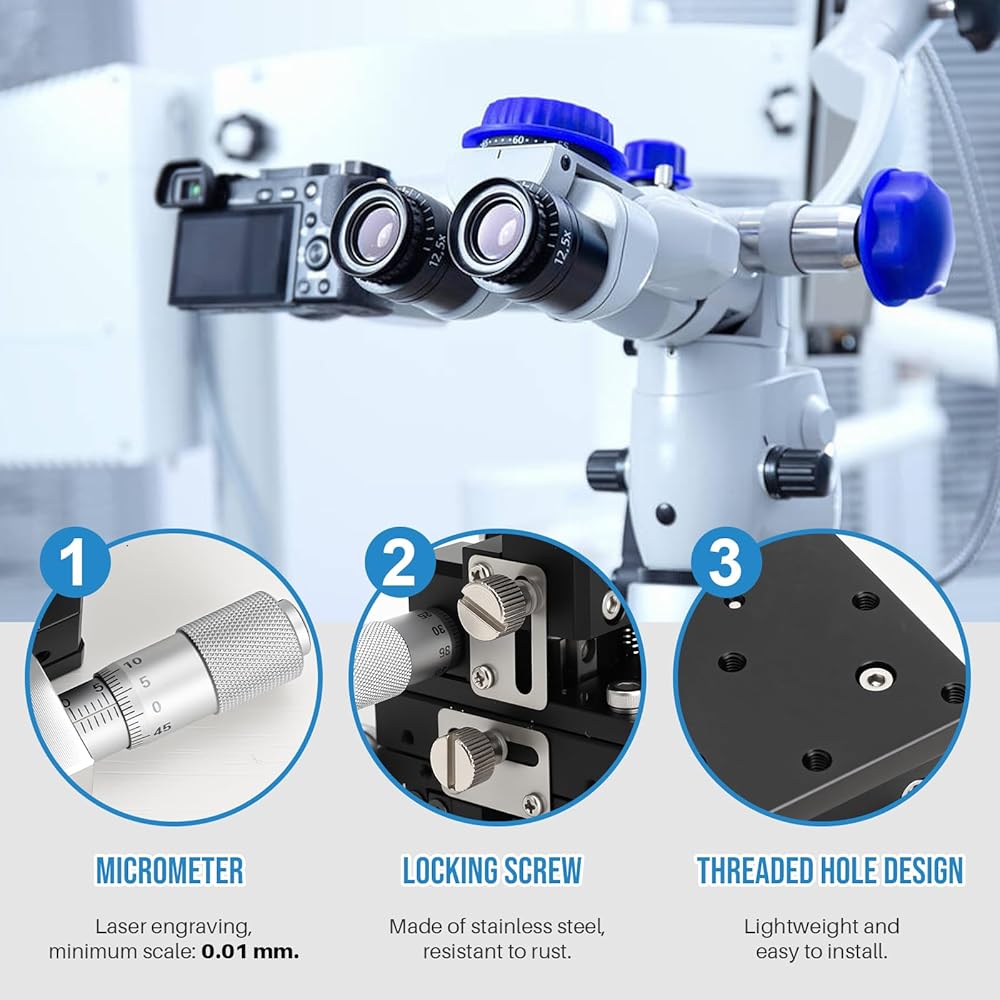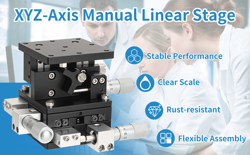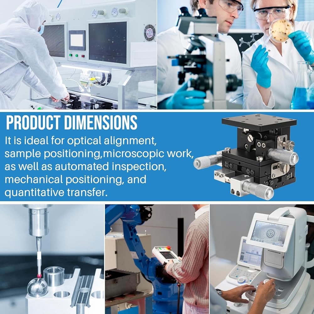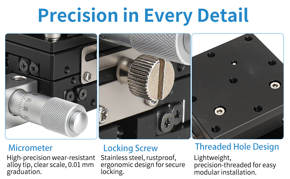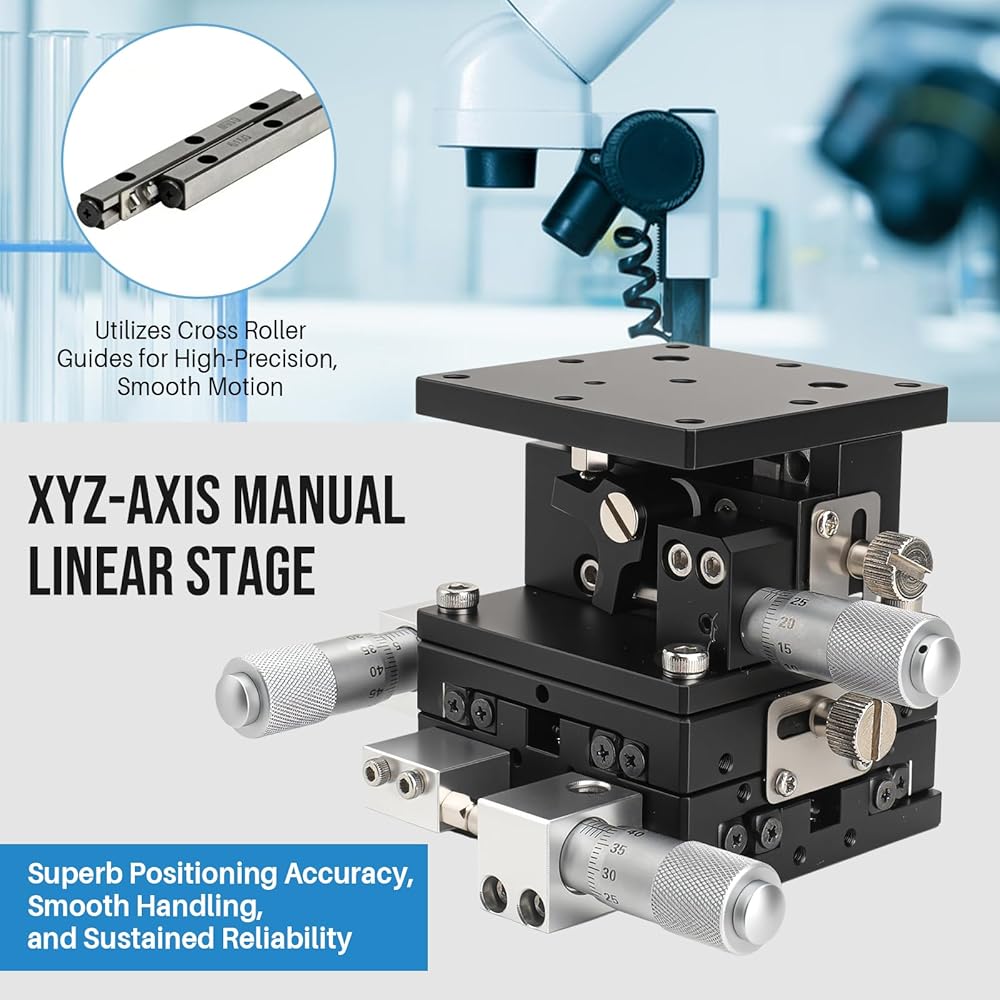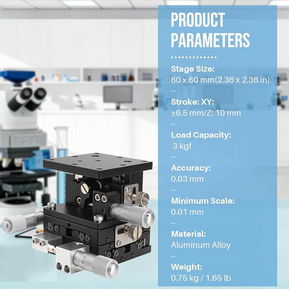 دقة عالية: تتميز هذه المرحلة الخطية xyz ثلاثية المحاور بمنصة مقاس 60 × 60 مم (2.36 بوصة). انتقال المحور XY: ±6.5 مم؛ حركة المحور Z: 10 مم؛ الدقة: 0.03 مم؛ الحد الأدنى للمقياس: 0.01 ملم. يضمن دليل الأسطوانة المتقاطع المدمج حركة سلسة ودقيقة بشكل استثنائي مع كل تعديل.