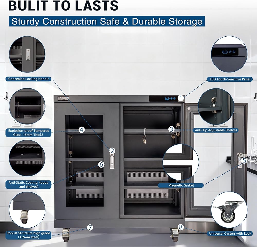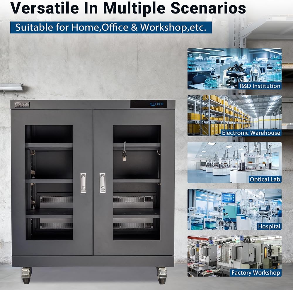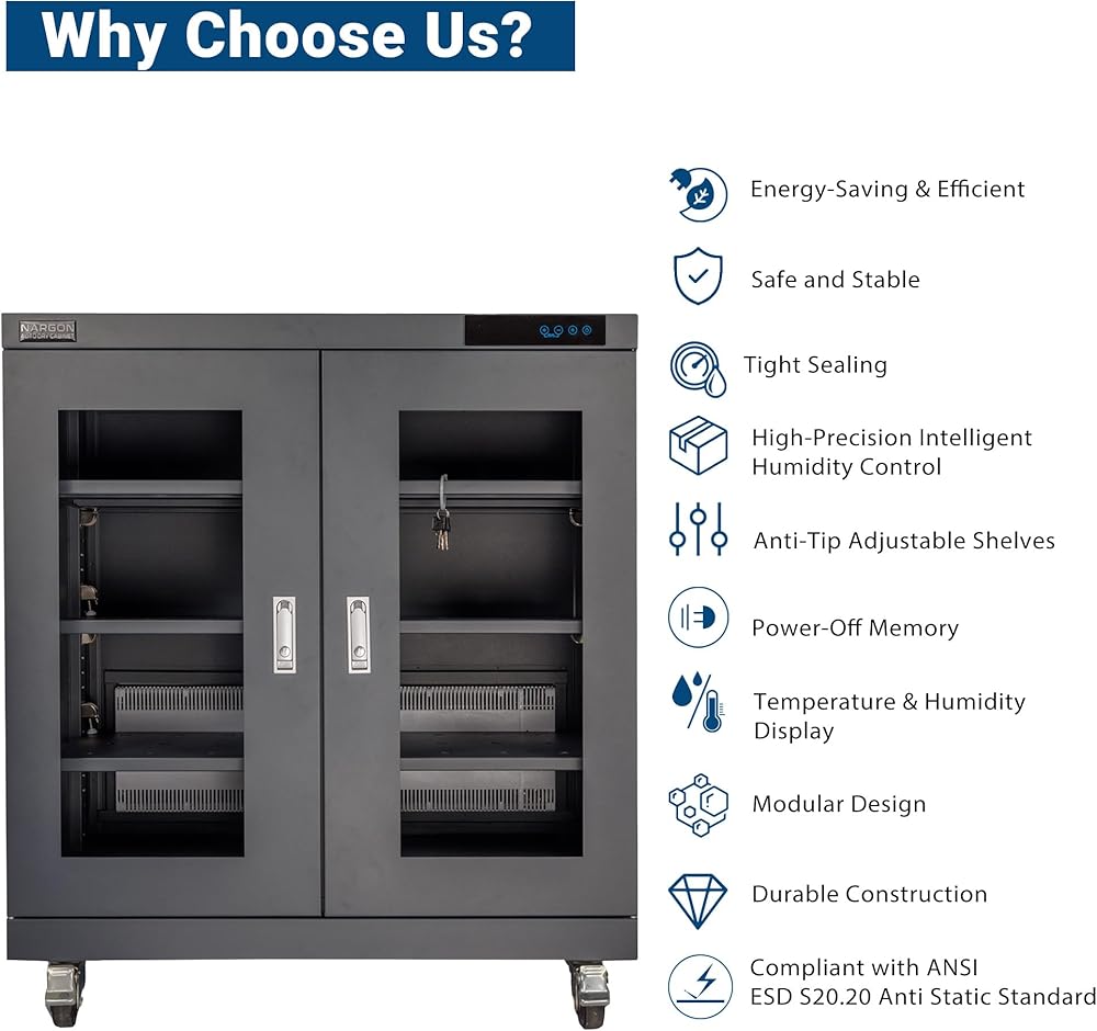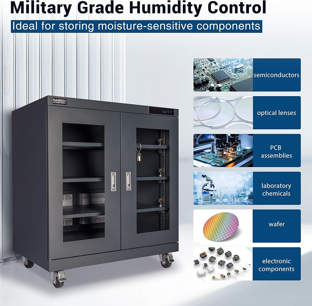 خزانة NARGON 1-20% RH 450L الإلكترونية الجافة، خزانة تجفيف ESD لتخزين العدسات البصرية، تجميعات РСВ، الرقاقة، المكونات الإلكترونية، أشباه الموصلات، المواد الكيميائية المخبرية، موديل NMC452CF