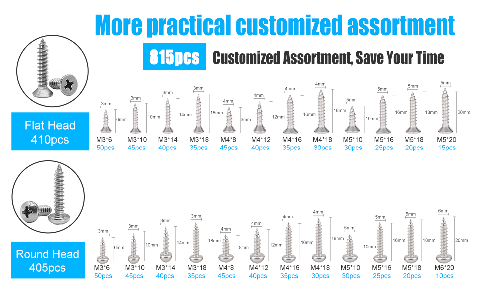 815pcs M6 M5 M4 M3 مجموعة متنوعة من مسامير الخشب، متري الفولاذ المقاوم للصدأ متنوعة مسامير التنصت على الذات مجموعة تروس شقة عموم رئيس فيليبس محرك الحفر لسطح السفينة دريوال الصفائح المعدنية الخرسانية