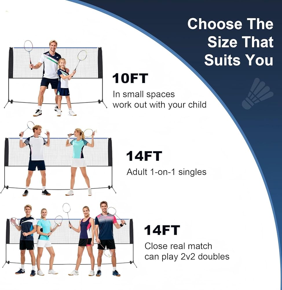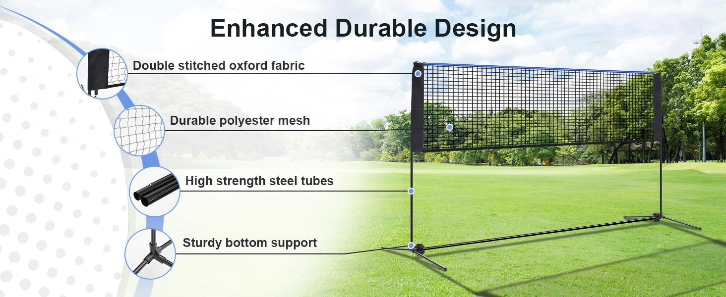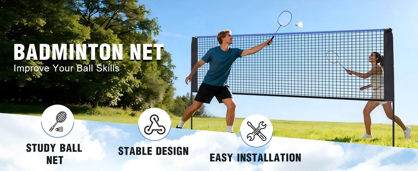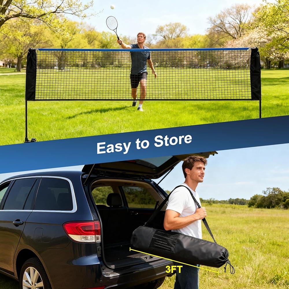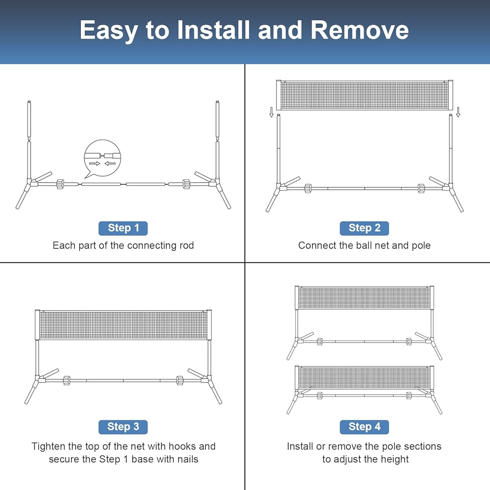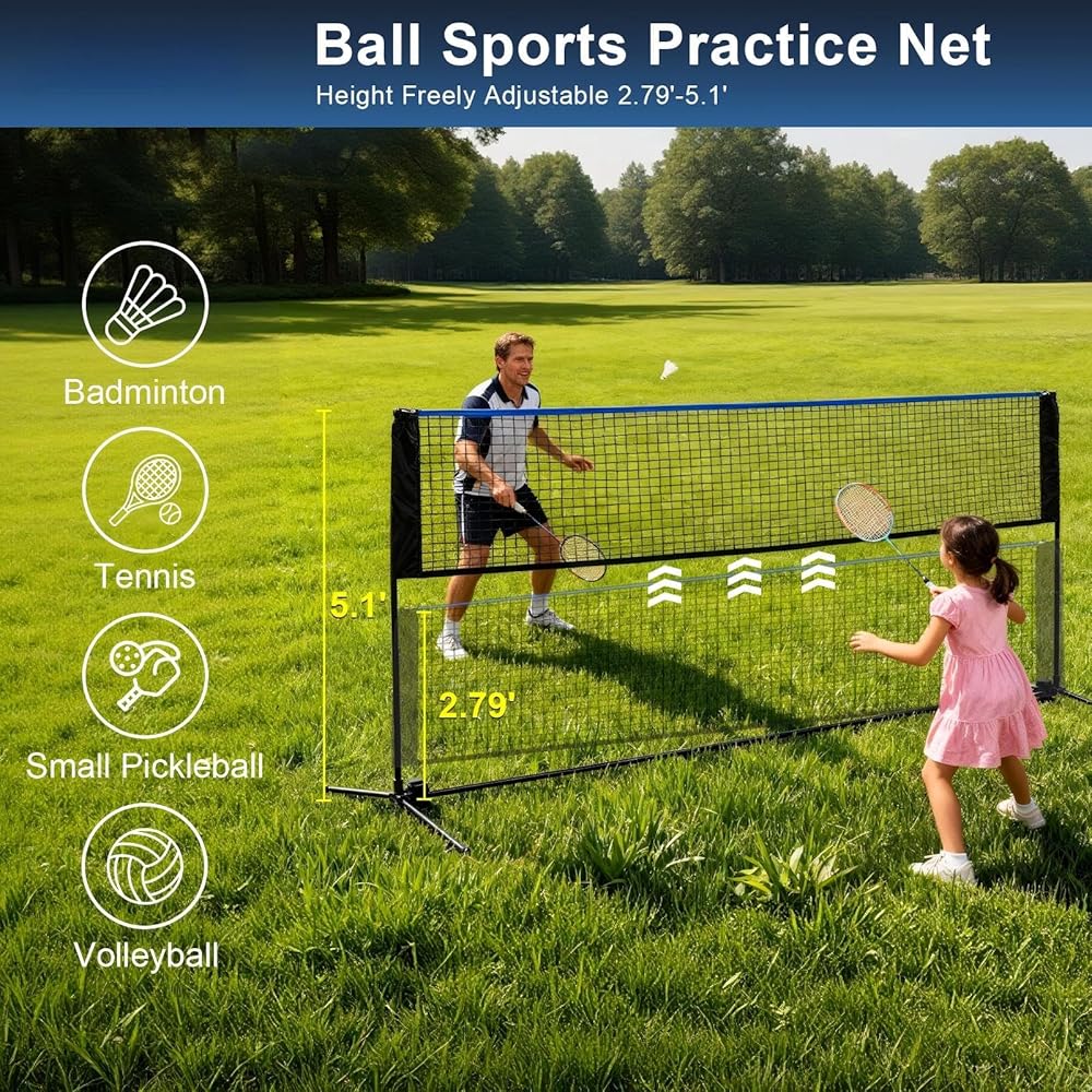 Boost your indoor and outdoor enjoyment with the KMFurnila Portable Badminton Net. This all-in-one multi-sport net is ideal for badminton, pickleball, tennis, soccer tennis, and kids' volleyball alike. It comes with adjustable height and multiple width choices to fit all your activity needs, delivering non-stop fun for family members and friends of all ages. Whether it's for backyard matches, beach day activities, or indoor gameplay, this is the go-to portable solution for active, engaging entertainment. Built for long-lasting performance, the KMFurnila badminton net boasts heavy-duty construction, featuring durable nylon mesh and rust-resistant, powder-coated steel poles. Engineered to hold up against intense indoor volleyball games and harsh outdoor conditions alike, this dependable backyard badminton net offers outstanding stability and sturdiness, promising years of reliable use and enjoyment. Enjoy unmatched convenience with this highly portable design. The lightweight, foldable KMFurnila portable tennis net tucks neatly into the included durable carry bag for fuss-free storage and transport. Take your portable pickleball net, mini volleyball net, or badminton set with net anywhere you want—whether it's your own backyard, a local park, or even a driveway setup for impromptu matches. Setting up your KMFurnila portable badminton net couldn't be easier: it takes less than 3 minutes, with no extra tools or ground stakes required. The poles are linked via elastic cords, eliminating loose components and ensuring a hassle-free assembly process. Effortlessly adjust the height to switch between uses—from a compact kids' volleyball net to a full-size indoor volleyball net—and get ready to dive into endless fun with badminton shuttlecocks right away.