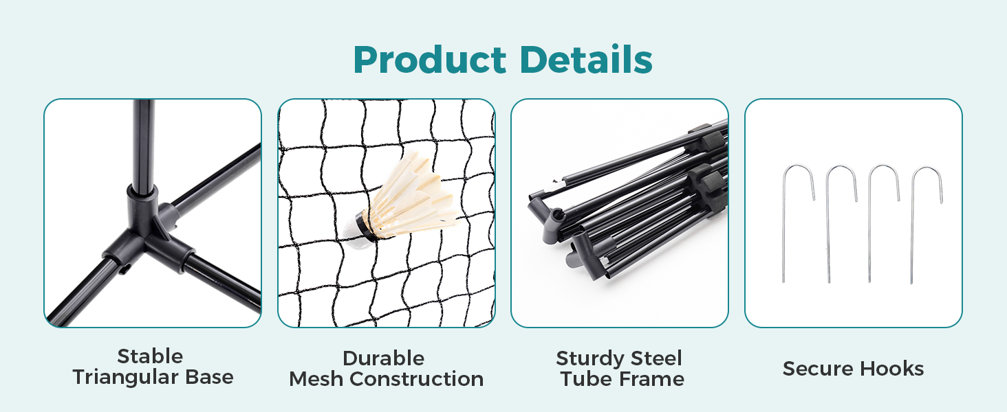 تركيب سريع: لا توجد حاجة لأي أدوات - يتم تركيب شبكة كرة الريشة المحمولة بسرعة. تتصل الأعمدة بسلاسة باستخدام أسلاك مرنة متخصصة، مما يضمن بقاء الشبكة مشدودة ويمنع الترهل.