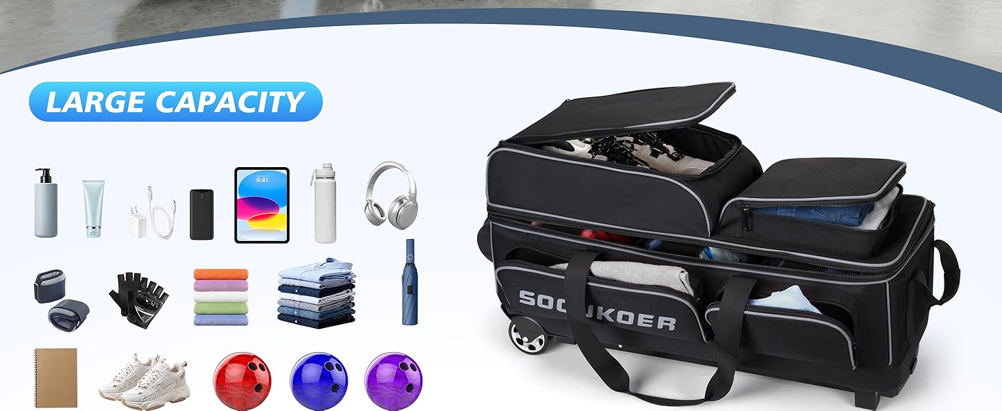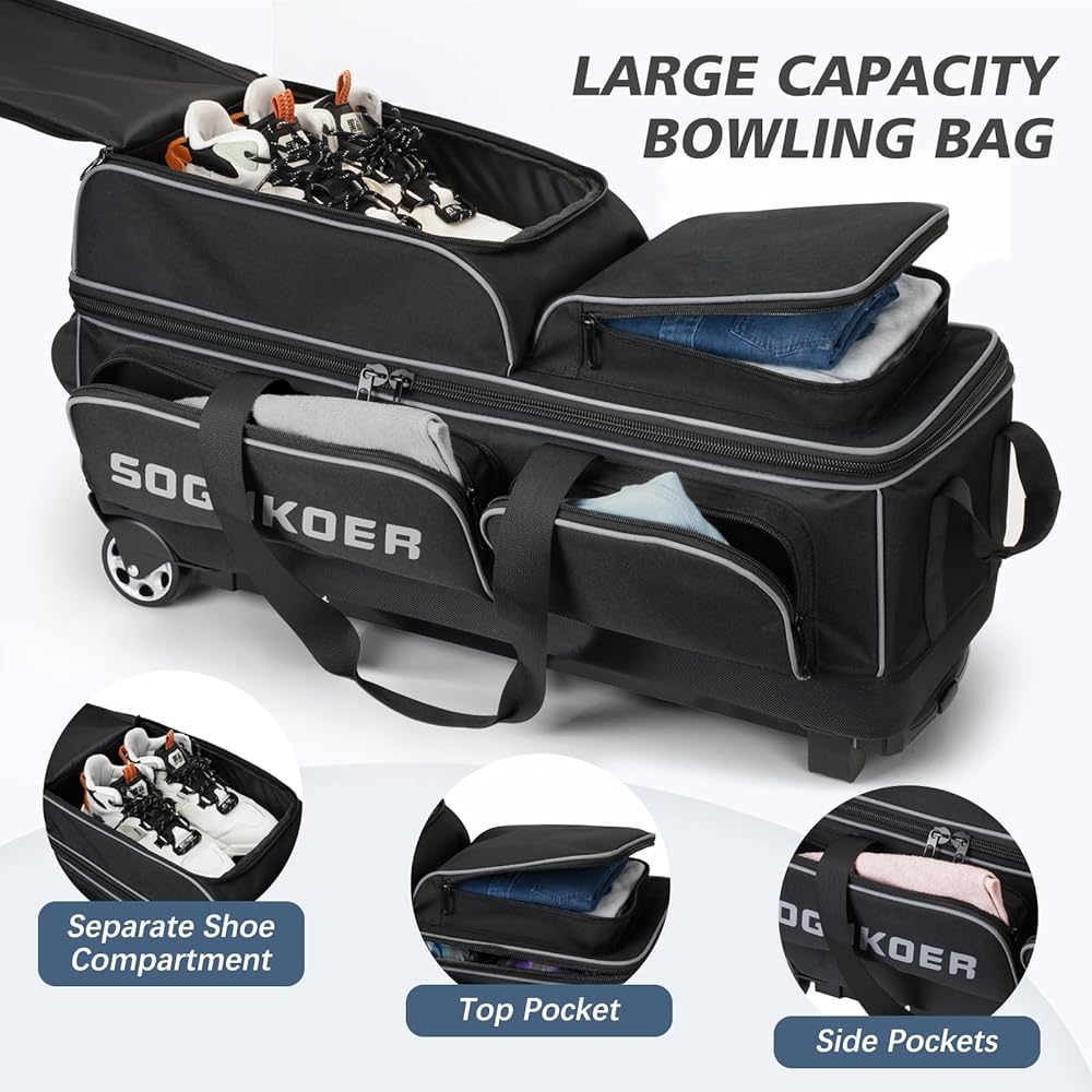 حجرة أحذية كبيرة وجيوب متعددة: يمكن لحجرة الأحذية العلوية في حقيبة البولينج المكونة من 3 كرات أن تحمل أحذية البولينج للرجال مقاس 16 بوصة، بينما يمكن للجيوب الجانبية والأمامية حمل المناشف وأساور المعصم وحلول التنظيف وغيرها من ملحقات البولينج