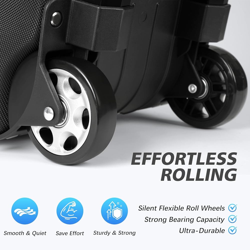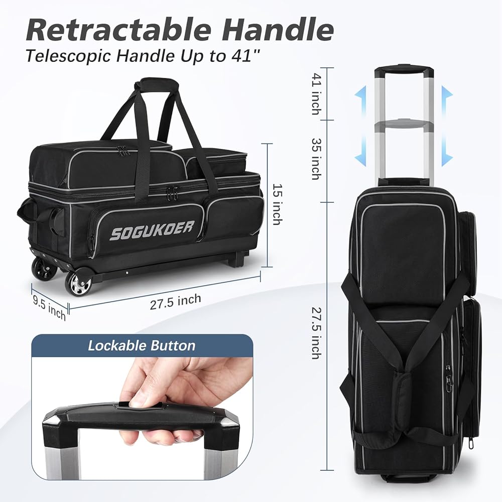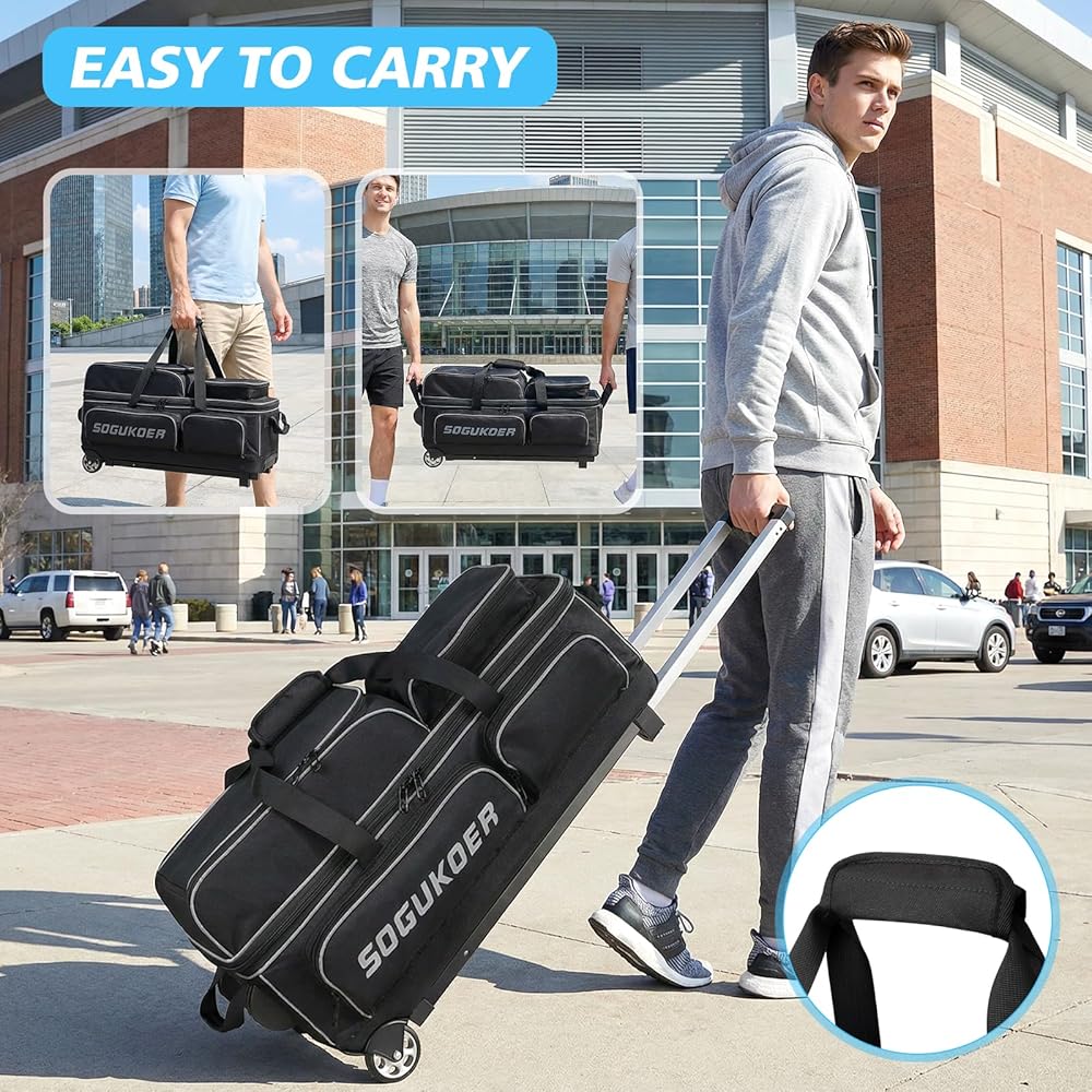 سهل الحمل: يمتد المقبض التلسكوبي المكون من قسمين حتى 40 بوصة، ويتميز بمقبض سميك غير قابل للانزلاق ومقابض جانبية مساعدة. تدعم حقيبة البولينج ثلاث طرق للرفع: الدفع والسحب والرفع العلوي والرفع الجانبي، مما يجعل الحركة أكثر مرونة