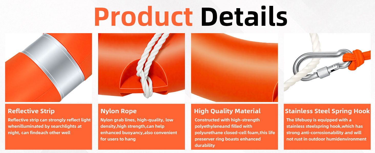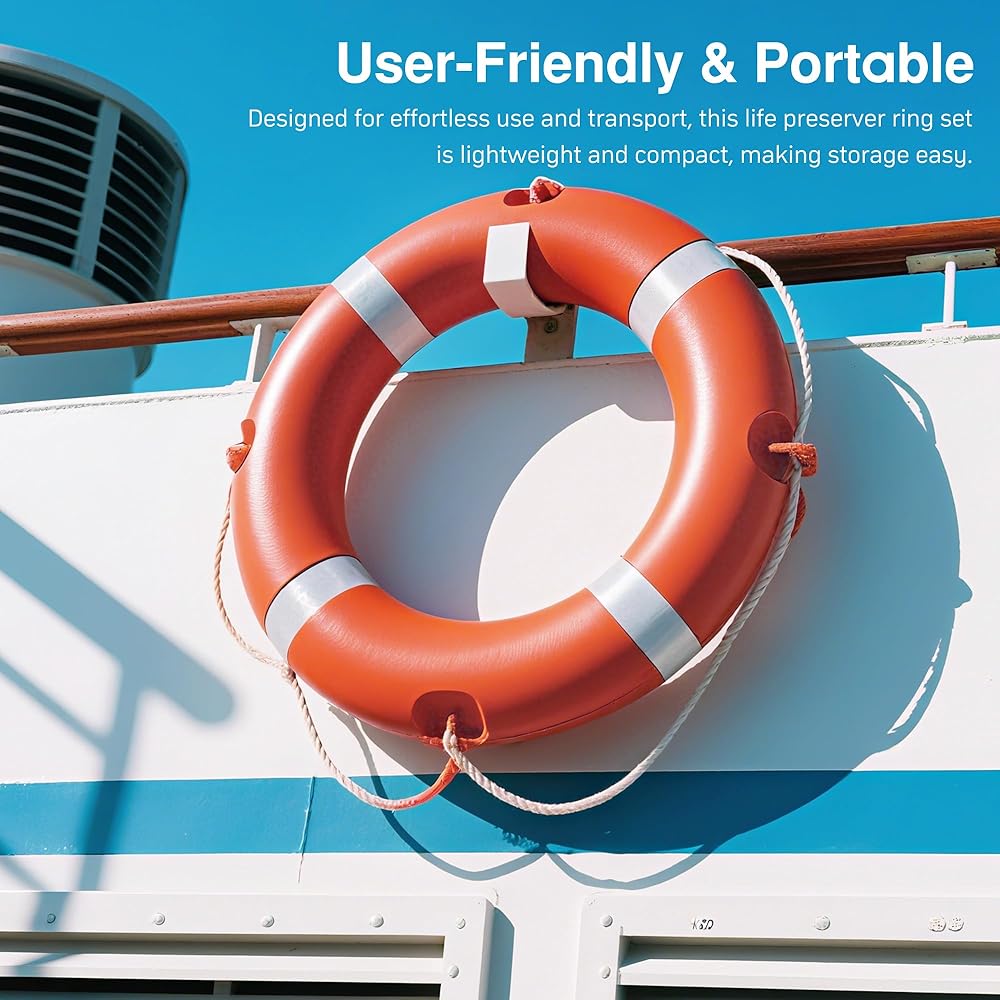 【Enhanced Safety Design with Reflective Tape】 The boat safety throw ring includes a durable nylon grabbing rope and upgraded reflective strips, making the life preserver ring highly visible during both day and night. The bright orange color combined with reflective elements improves rescue efficiency in low-light conditions.