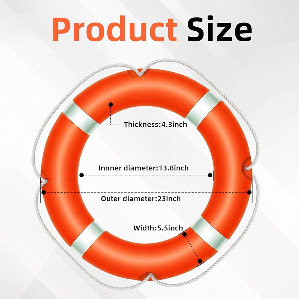 【Standard Size & Strong Load Capacity】 This throwable flotation device life preserver ring measures 23" outer diameter and 13.8" inner diameter, weighing 2.5kg. Designed to meet international safety standards, it supports up to 600KG/1300LBS, making it suitable for both adults and children in emergency rescue situations.