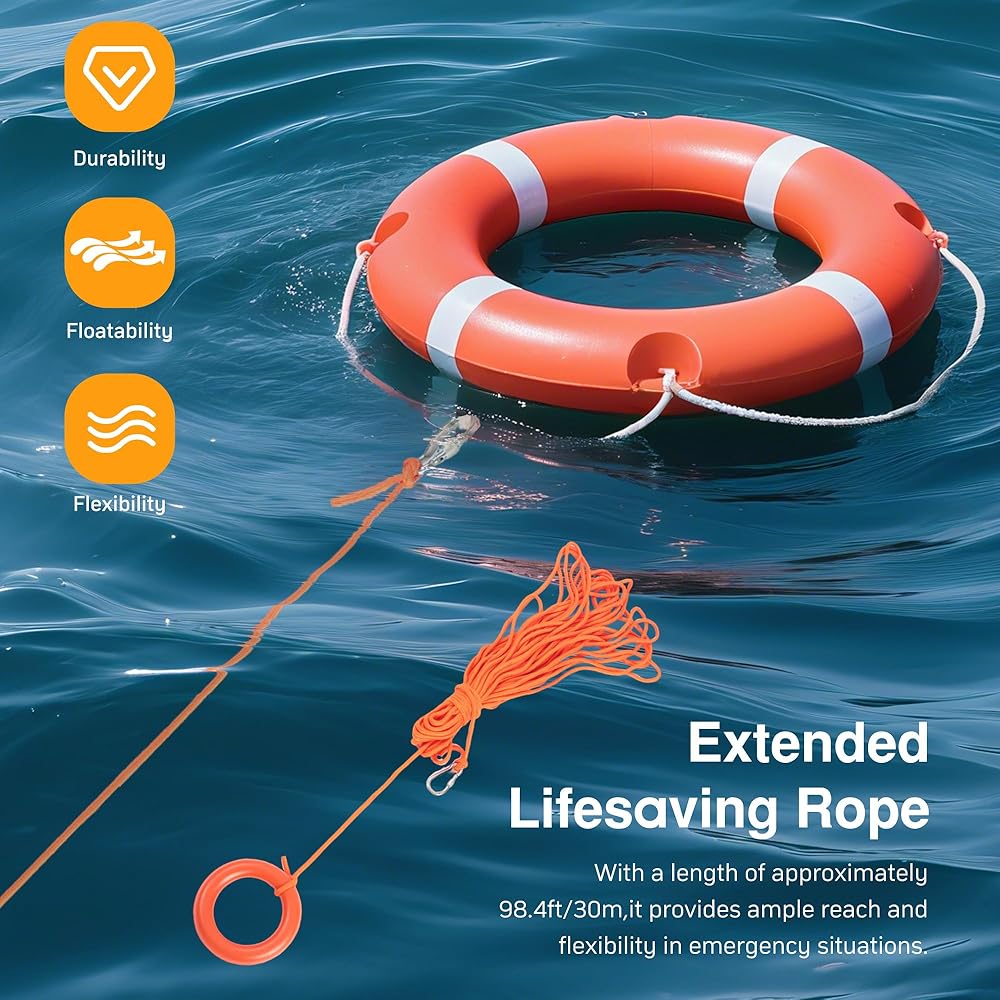 【High Buoyancy & Reliable Rope】 Equipped with a 98.4FT water floating lifesaving rope, this boat throwable flotation device provides strong buoyancy and stability during rescue. The rope features a floating bracelet and metal buckle, lightweight yet durable, ensuring effective performance in lifesaving emergencies.